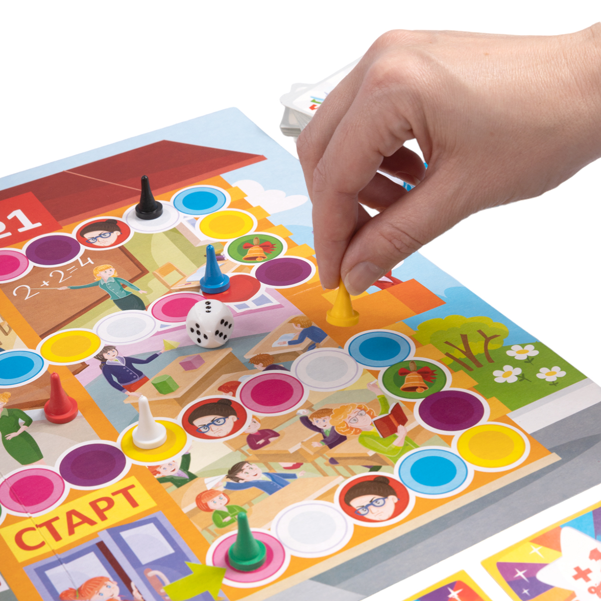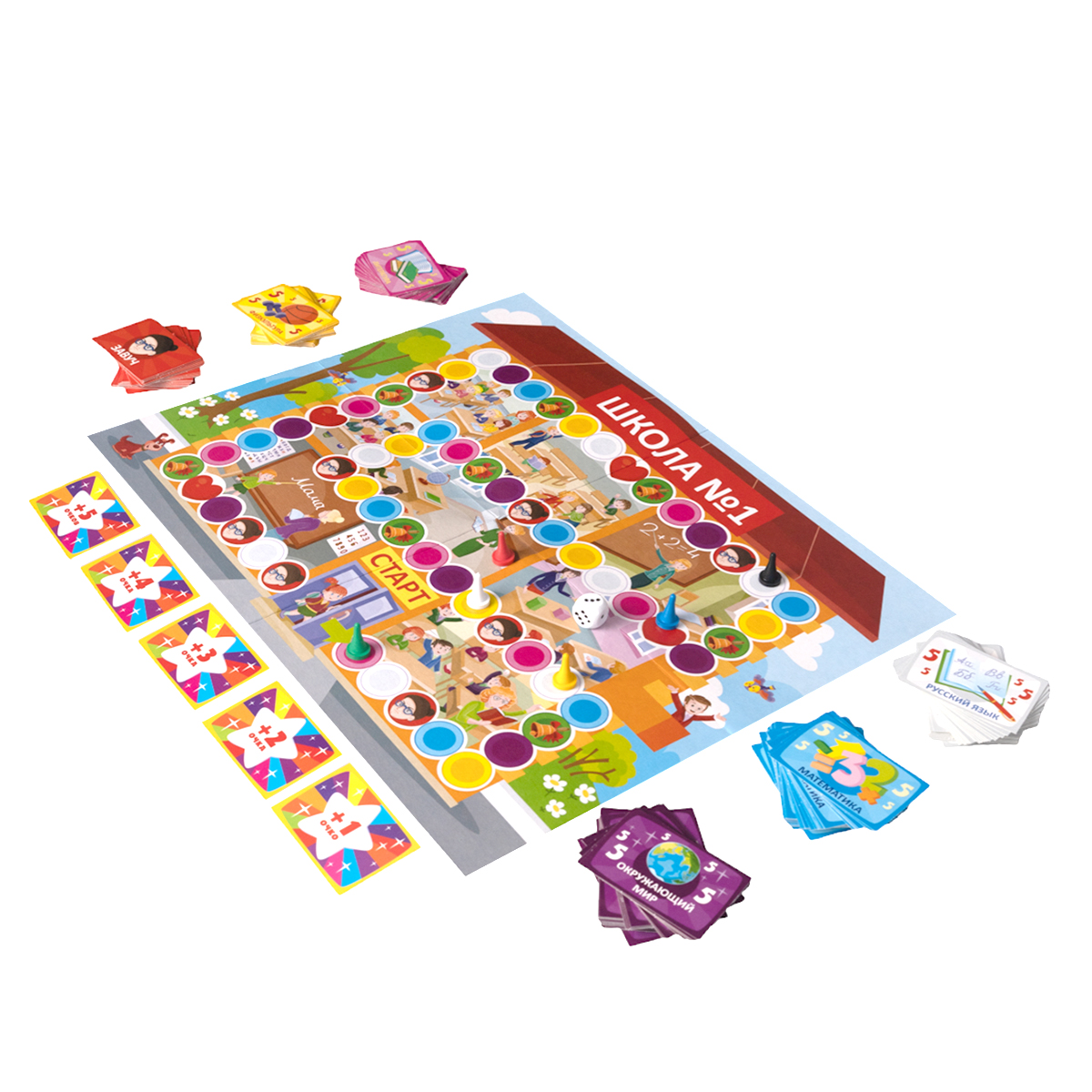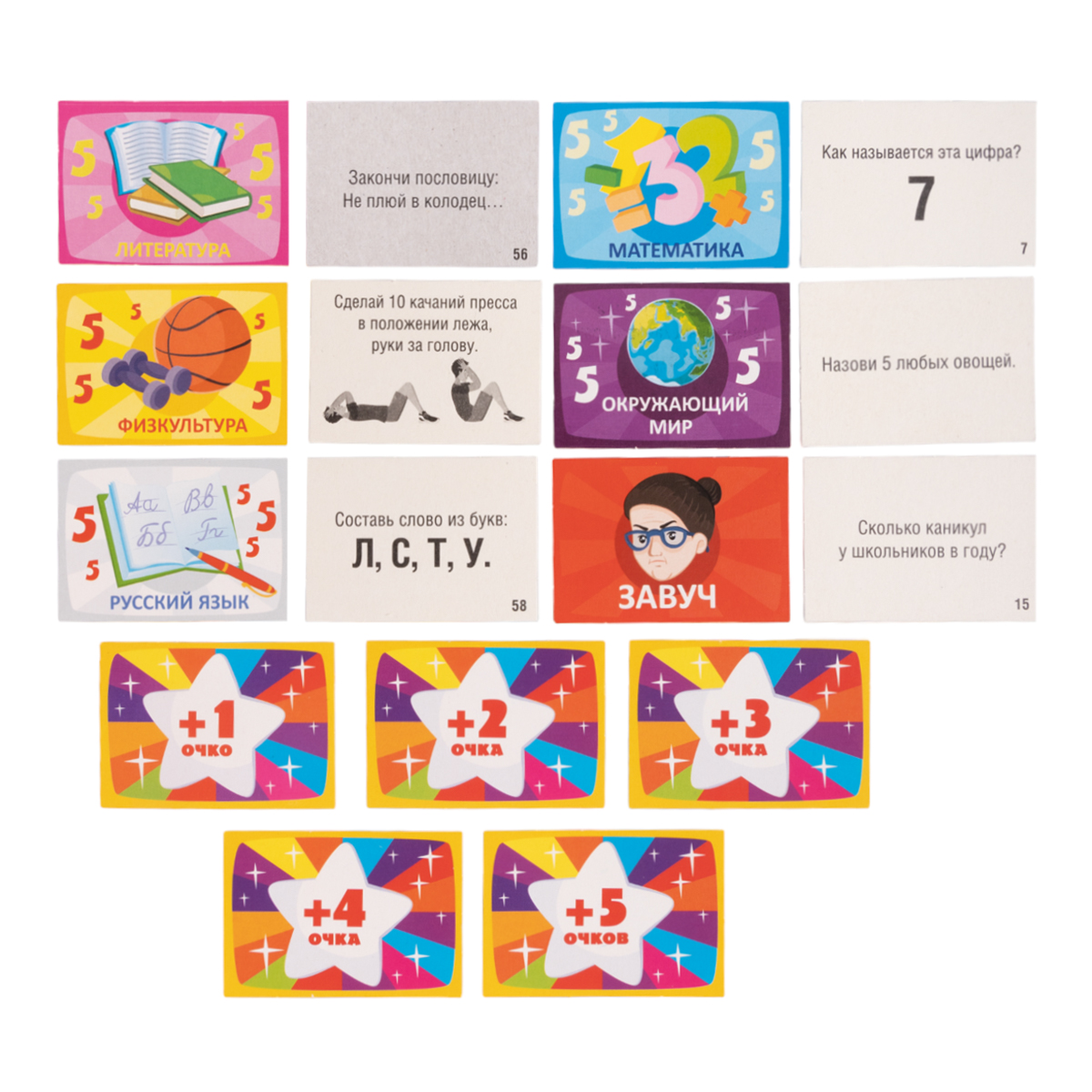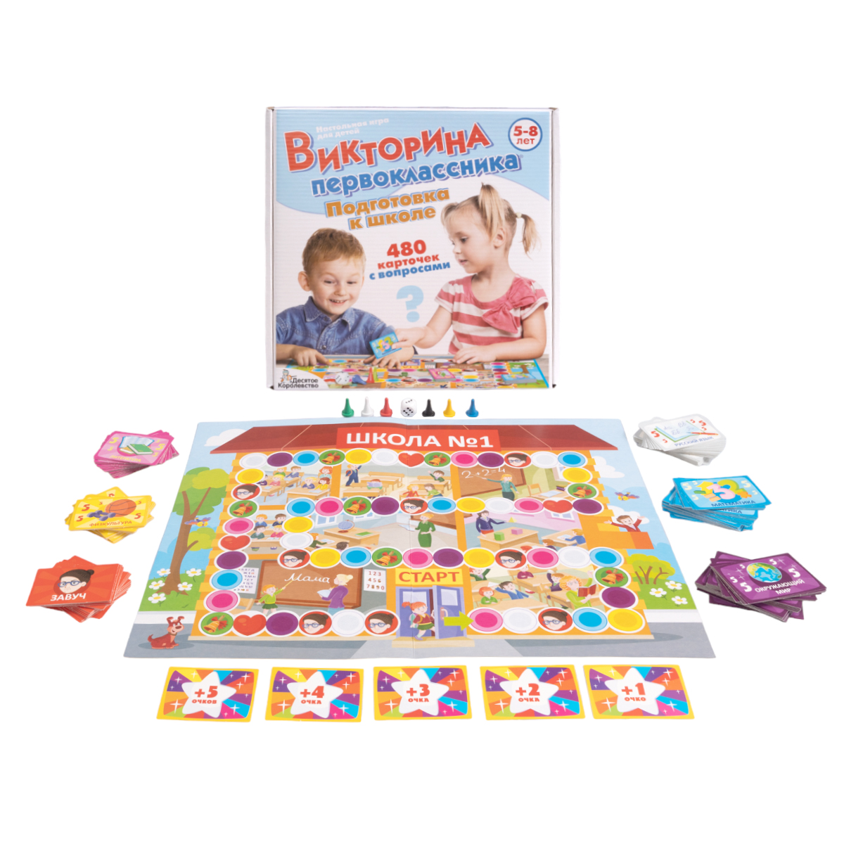 «Викторина первоклассника. Подготовка к школе» – это увлекательная настольная игра-викторина для дошкольников, с помощью которой в игровой форме можно подготовить ребёнка к школе. Состав игры: игровое поле – 1 шт. (33 х 42 см), карточки – 480 шт. (4,5 х 6,5 см), разноцветные игровые фишки – 6 шт. (цвета: красный, белый, чёрный, жёлтый, зелёный, синий), кубик «1–6» – 1 шт. (цвет – белый), правила игры. Материалы: картон, пластмасса, бумага. Игра рассчитана на 2–6 игроков (возможна игра с количеством участников до 12 человек) и предназначена для детей в возрасте от 5 до 8 лет. Игра поможет проверить подготовку ребёнка к школе, а также станет помощником в развитии логики, мышления, внимательности и реакции.