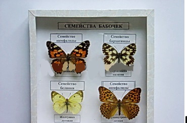 В монтажной коробке под стеклом представлены (не менее 2-ух) насекомые некоторых семейств отряда Чешуекрылые (Бабочки). По особенностям жилкования крыльев и некоторым другим признакам чешуекрылых делят на семейства, которых насчитывается более тридцати.