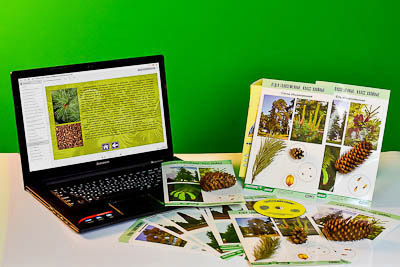 В коллекции представлены побеги, шишки и семена хвойных растений: сосны, ели, кипариса, туи, лиственницы, можжевельника. Натуральные образцы сопровождаются фотографиями взрослых растений. Планшеты формата А4 изготовлены из картона и ламинированы глянцевой пленкой.