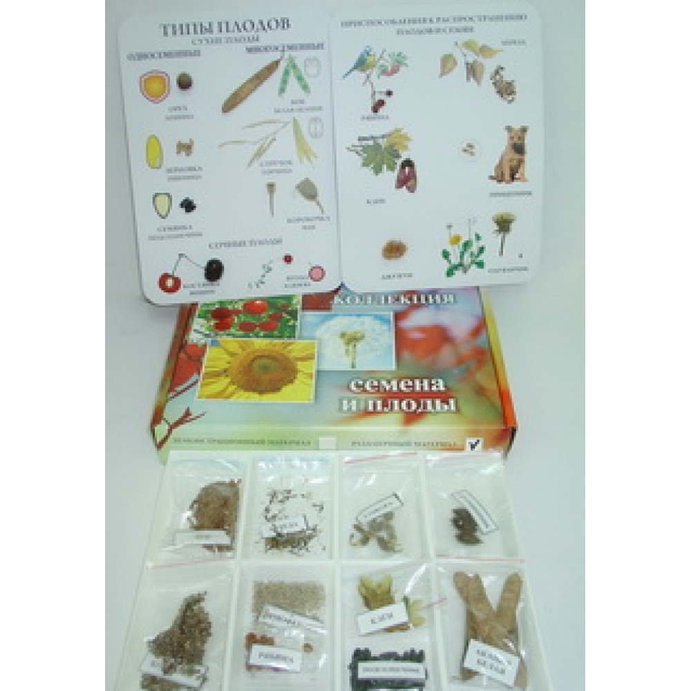 Планшеты демонстрируют: 1) типы плодов (сухие и сочные плоды); 2) приспособленность к распространению плодов и семян. Вторая часть коллекции содержит раздаточный материал - десять видов различных семян и плодов, по которым можно определить их тип (сухие, сочные) и приспособленность к распространению.