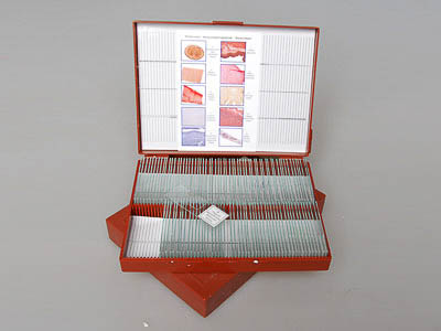 поперечный срез спинного мозга (нервные клетки) - 15 шт., ткани желудка - 5 шт., кровь человека - 15 шт., однослойный эпителий - 15 шт., гиалиновый хрящ - 15 шт., костная ткань - 5 шт., сперматозоиды человека - 15 шт., гладкая мышечная ткань - 15 шт., поперечно-полосатая мышечная ткань - 5 шт., кровеносные сосуды - 5 шт. Всего: 110 шт.