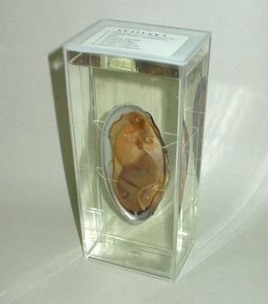 Препарат закреплен на стеклянной пластине, которая помещена в консервирующую жидкость и установлена в пазы прозрачного пластмассового сосуда и пластмассовой крышки. Сосуд герметично закрыт. На препарате представлен пресноводный моллюск - беззубка (двустворчатый моллюск) с одной удаленной створкой раковины, что дает возможность рассмотреть органы, которые пронумерованы: