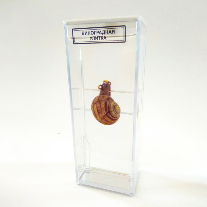На препарате представлена виноградная улитка - представитель наземных брюхоногих моллюсков из отряда Pulmonata (легочные улитки), которые относятся к семейству Helicidae (хелициды). Внешне улитка состоит из туловища и раковины. При этом мягкую часть разделяют на голову с двумя парами щупалец и ногу. Внутренние органы окружены мантией, часть которой видна снаружи. На препарате показана виноградная улитка с раковиной и выдвинутой вперед головой с двумя парами щупалец. Препарат закреплен на стеклянной пластине, которая помещена в консервирующую жидкость и установлена в пазы прозрачного пластмассового сосуда и пластмассовой крышки. Сосуд герметично закрыт. Препарат в прозрачном пластмассовом сосуде, с наклеенной на него этикеткой с наименованием, упакован в картонную коробку с маркировкой.