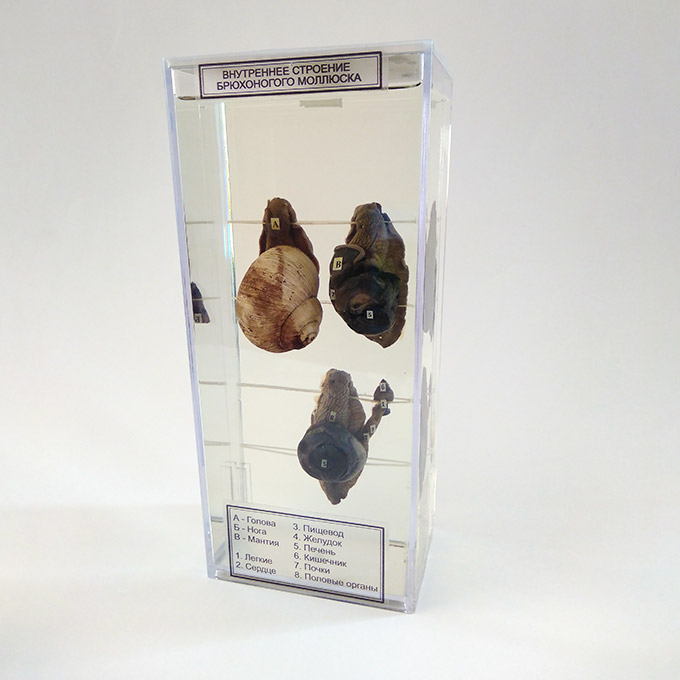 Препарат закреплен на стеклянной пластине, которая помещена в консервирующую жидкость и установлена в пазы прозрачного пластмассового сосуда и пластмассовой крышки. Сосуд герметично закрыт. На препарате представлен сухопутный моллюск - виноградная улитка. Препарат состоит из трех объектов: улитка с раковиной, улитка без раковины, улитка с отпрепарированными органами, на которых можно рассмотреть следующие детали строения: