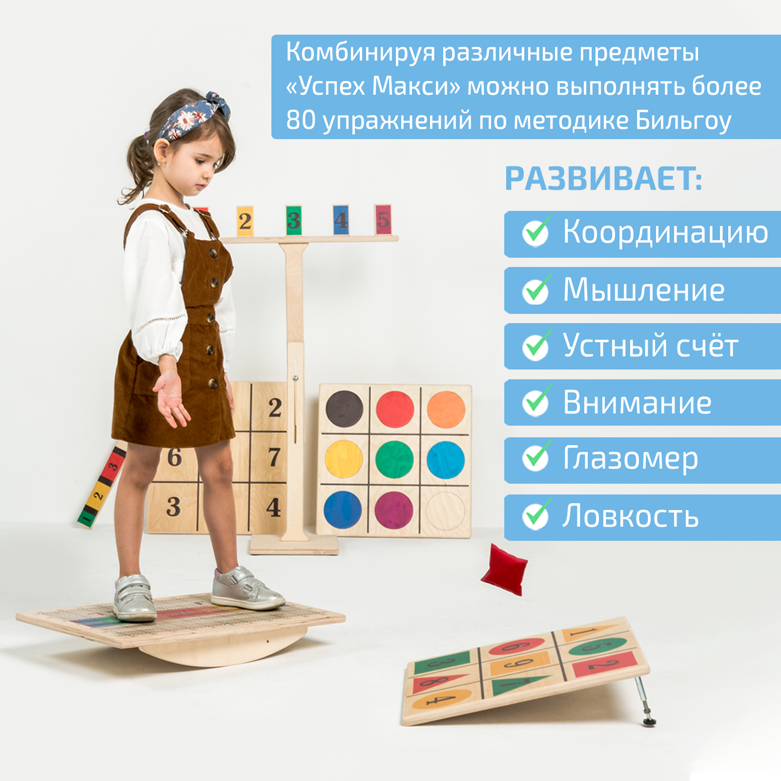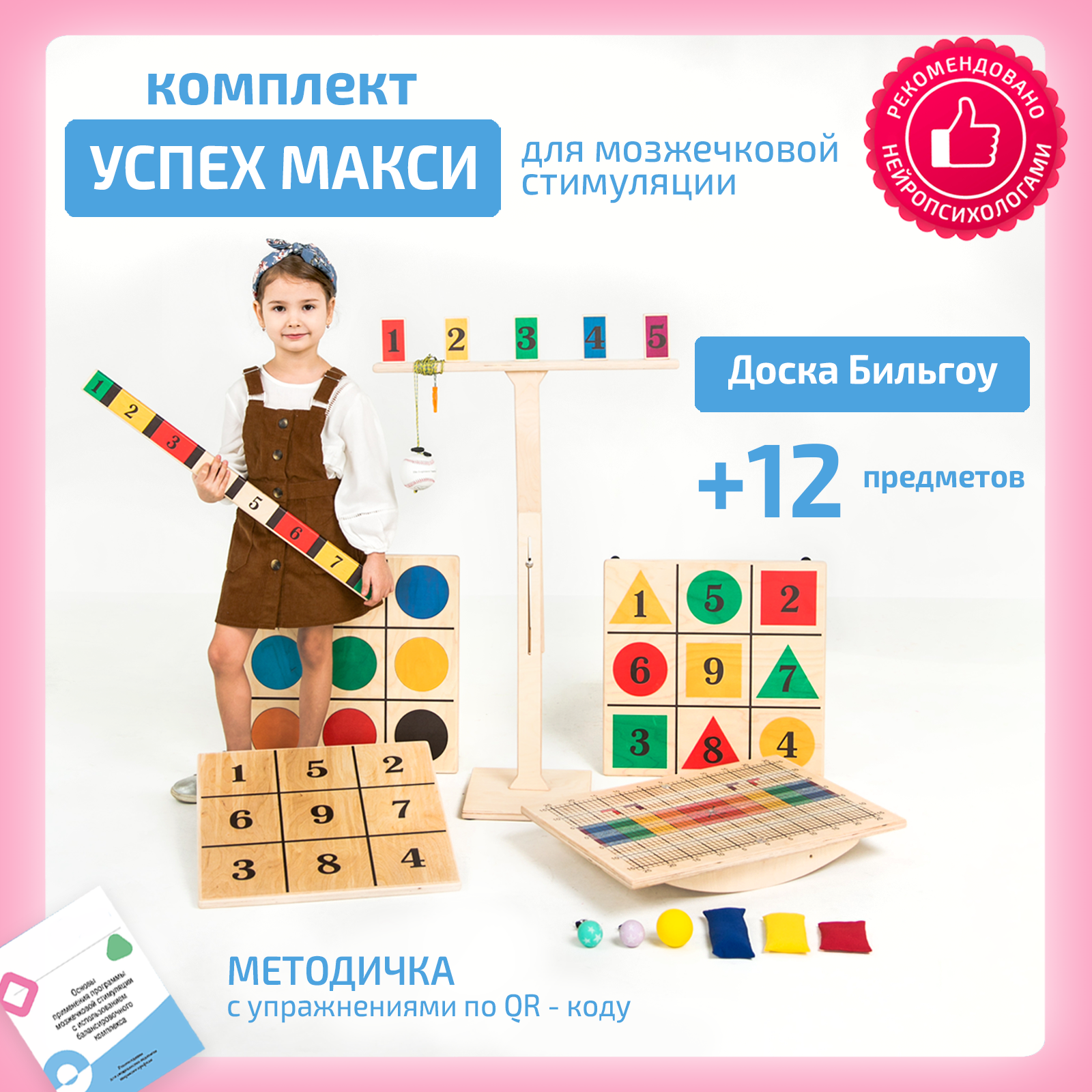 Комплекс мозжечковой стимуляции полный предназначен для выполнения физических упражнений, которые способствуют развитию баланса и координации. Система упражнений позволяет развивать участки головного мозга, отвечающие за формирование высших психических функций, речи и поведения ребенка. В результате совершенствуется координация, развивается память, концентрация, внимание, стабилизируется работа вестибулярной системы. Комплект Макси — полный комплекс тренажеров Бильгоу.