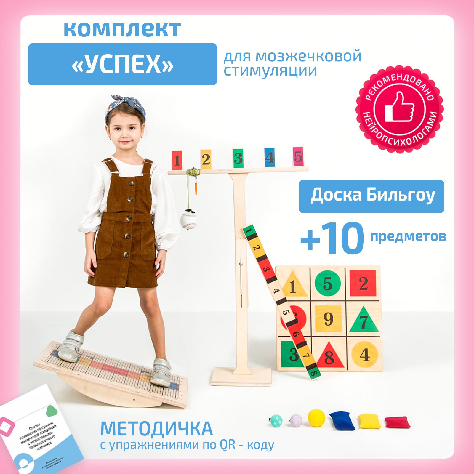 В комплекте: доска балансировочная для мозжечковой стимуляции, мишень напольная, 3 цветных мешочка с крупой, 3 мяча (1 кинезиологический мяч и 2 каучуковых мяча), мяч-маятник и планка для отбивания, стойка с мишенями-целями. Также в комплект входит инструкция по работе с доской и методические рекомендации для эффективных занятий.