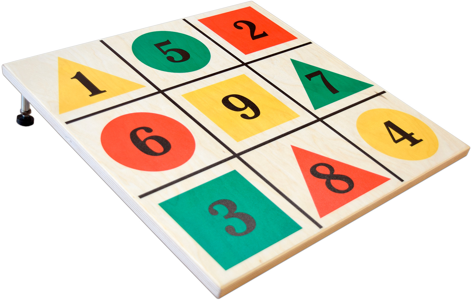 Мишень расположена на регулируемых ножках. На ней большим шрифтом нанесены цифры от 1 до 9, а также геометрические фигуры разных цветов. Можно использовать вместе с кинезиологическими или каучуковыми мячами.