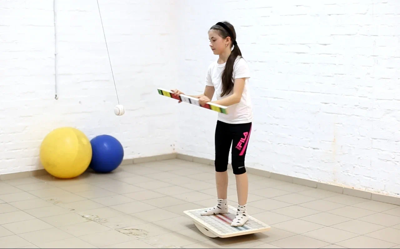 Мяч-маятник оснащен карабином и фурнитурой для крепления к потолку. Рейка, размеченная с дух сторон цветом и цифрами.