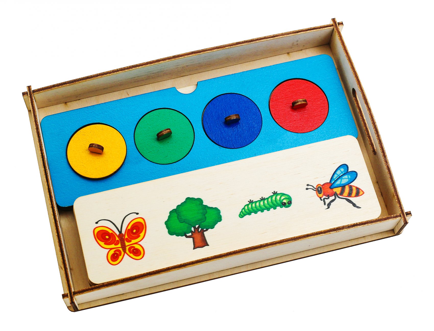1. Вставьте в планшет деревянную карточку с картинками, закройте окошечки. Планшет готов к игре: предложите ребенку открыть кружки и назвать, что изображено на картинках и какой предмет из них лишний. Почему?