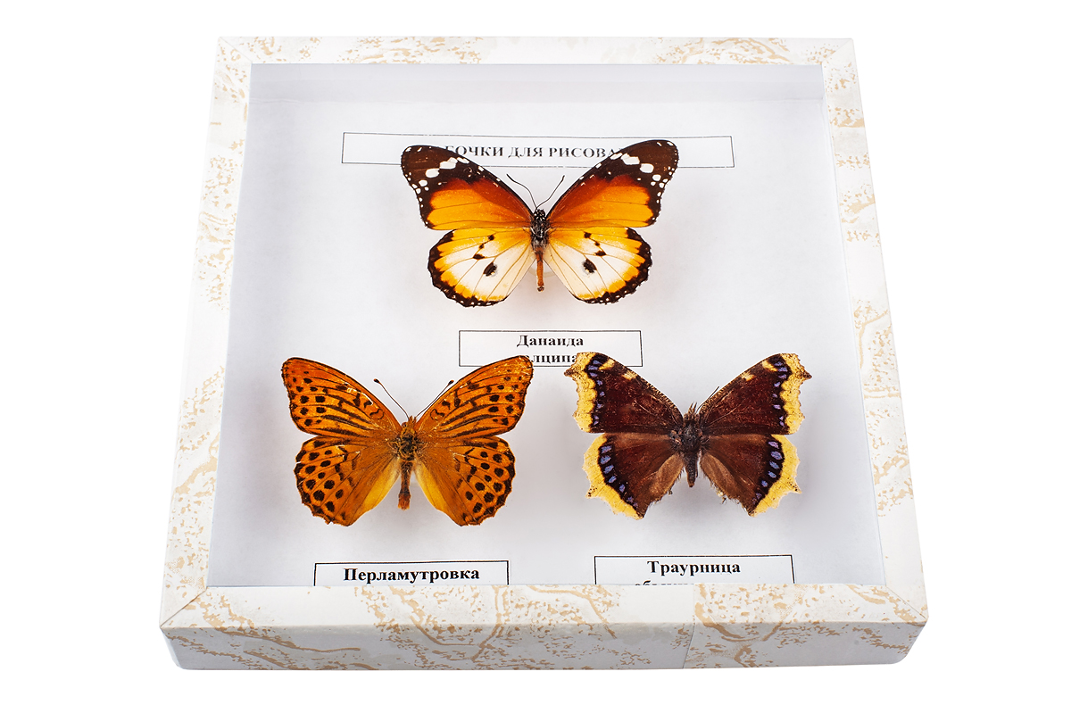 В коробке под стеклом смонтированы бабочки не менее 2-ух, которые возможно зарисовать. Бабочки в коробке находятся на специальных подставках. Это нужно для того, чтобы была возможность более детально рассмотреть особенности их внешнего строения. Под каждым объектом наклеена этикетка с видовым названием насекомого.
