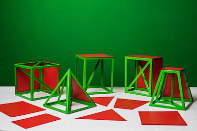 Набор состоит из 5 геометрических тел, ребра которых выполнены из металлических уголков, и пластиковых пластинок, обозначающих грани. Подробнее