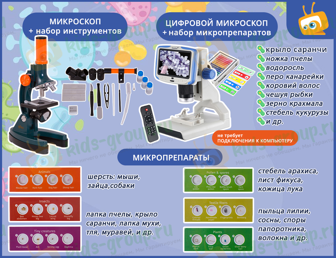 Цифровой микроскоп – прибор для исследования объектов любой степени прозрачности. Он подходит для изучения частей растений, насекомых и готовых микропрепаратов. В него можно рассматривать камни, монеты, компоненты электронных приборов и механизмов. Микроскоп также позволяет записывать фото и видео, причем управлять записью можно при помощи беспроводного пульта.