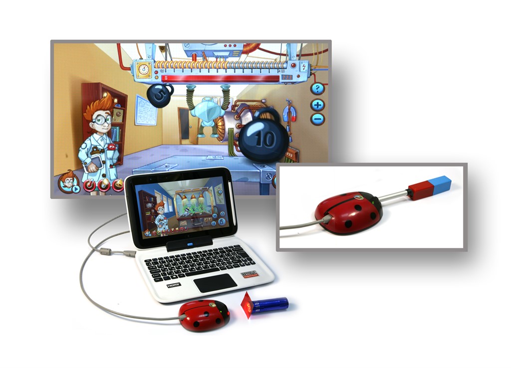 В ходе занятия с набором «Мультимедийная лаборатория» дети проводят эксперименты с использованием датчика в виде «Божьей коровки», а мультимедийный интерактивный герой ставит ребенку задачи и комментирует результаты экспериментов.