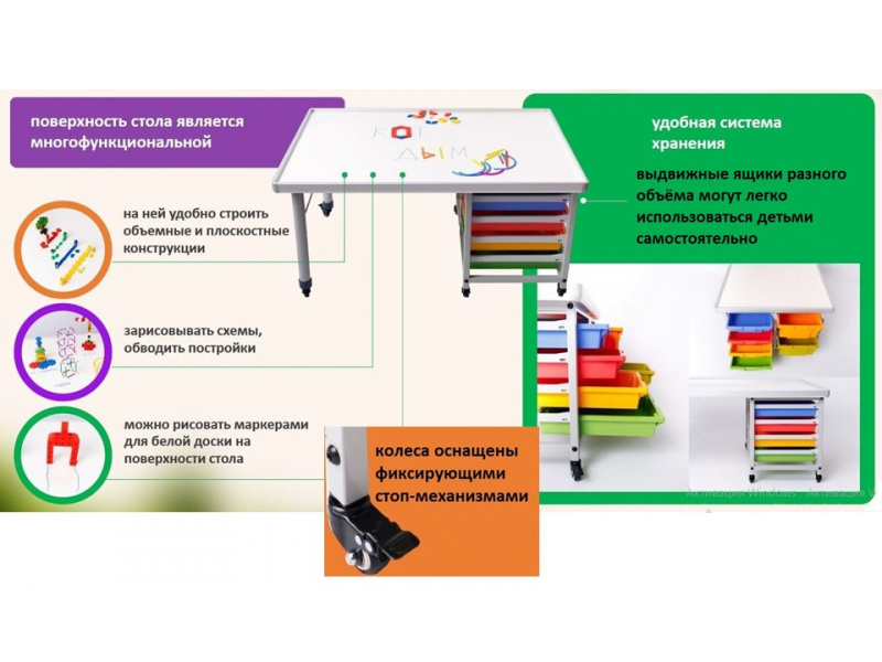 Стол «Конструирование» создан для педагогов дошкольного образования. Может использоваться для организации развивающей предметно – пространственной среды группы – центра «Конструирование» (стать частью центра или полноценным центром активности).