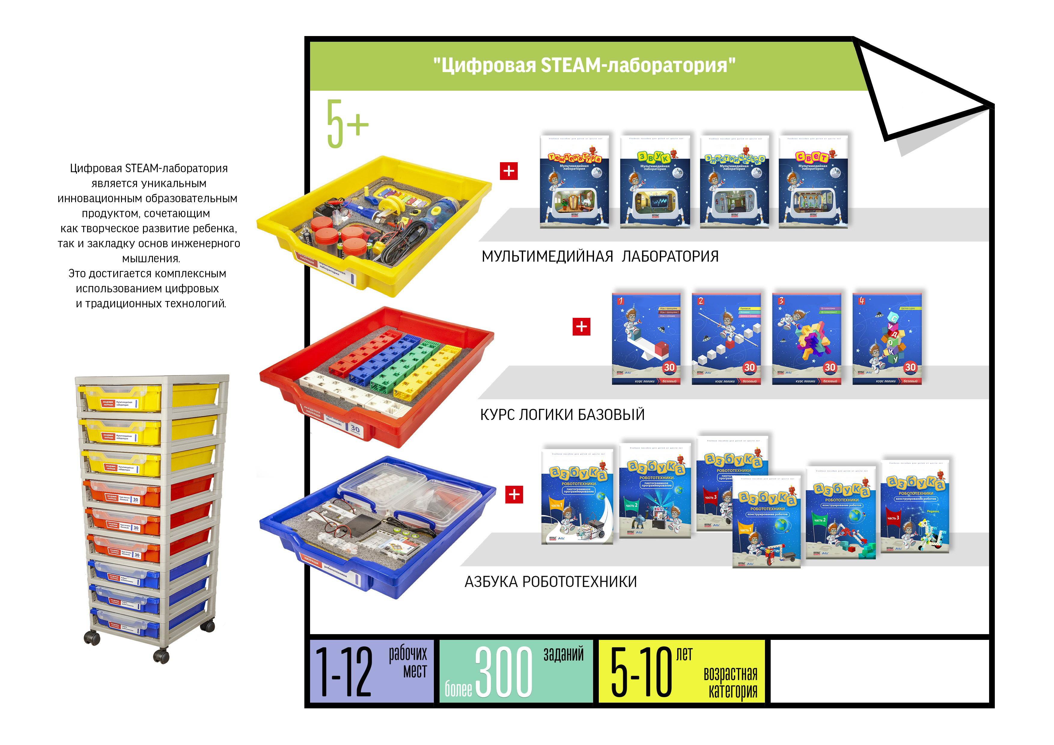 Цифровая STEAM–лаборатория представляет собой стойку на колесиках, в которую входят три образовательных модуля: Мультимедийная лаборатория «Изучаем окружающий мир с помощью датчиков» (темы: «Свет», «Звук», «Температура», «Электричество»), «Курс логики базовый» (логические игры и головоломки со специальными кубиками: домино, тримино, полимино, игры с проекциями, цветное судоку, 3D-головоломки), «Азбука робототехники» (робототехнический конструктор с программой для пиктограммного программирования и рабочие тетради с пошаговым алгоритмом действий). Подробнее