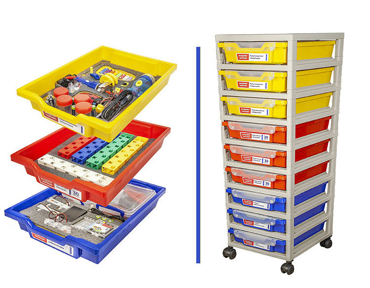Состав Модуль "Мультимедийная лаборатория" 3 шт. Модуль "Курс логики базовый" 3 шт. Модуль "Азбука робототехники" 3 шт. + методические руководства и ПО Стойка для оборудования на колесах (9 лотков)