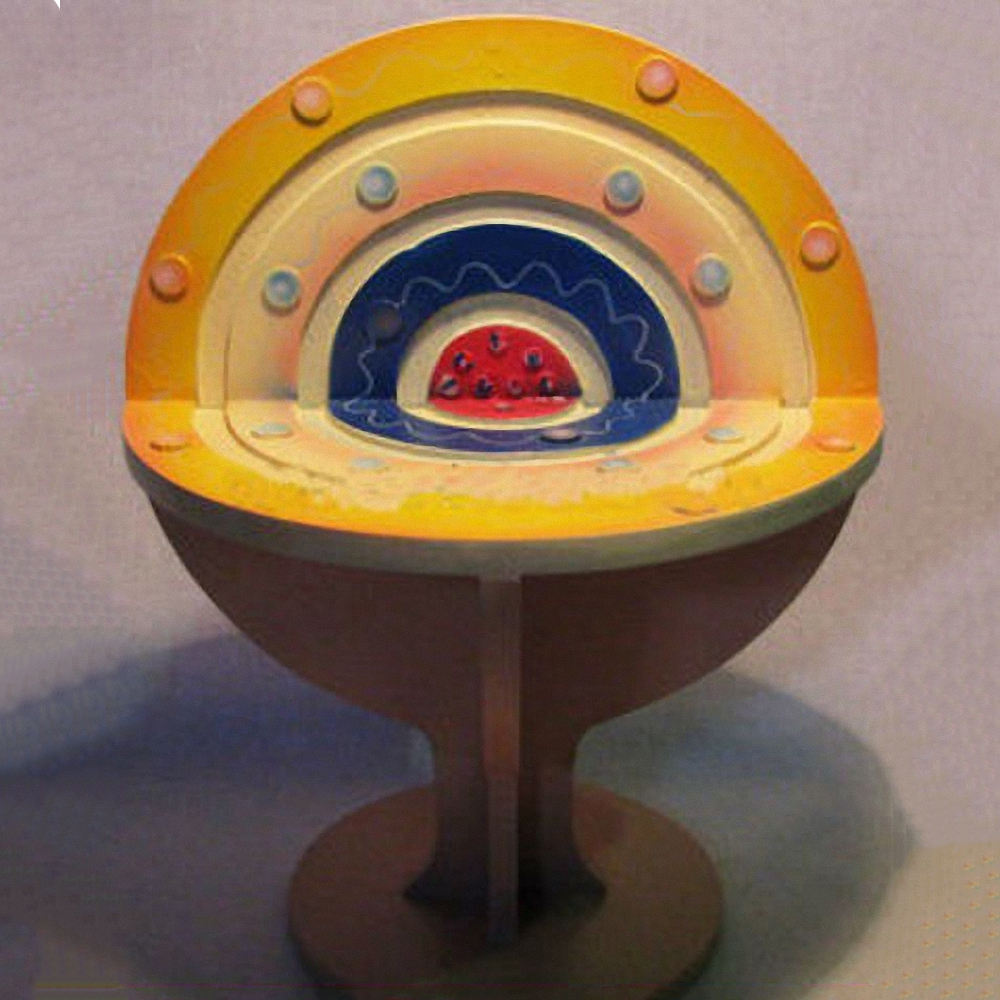 Модель неразборная, изготовлена из фанеры и окрашена. Представляет собой атом аргона, на котором хорошо видны: ядро, электронная оболочка, состоящая из нескольких энергетических уровней и электроны, находящиеся на этих энергетических уровнях. Причем, модель позволяет рассмотреть, что на самом ближнем к ядру энергетическом уровне не может располагаться более двух электронов, а на следующем на ним – более восьми электронов. Высота модели составляет ≈40см.