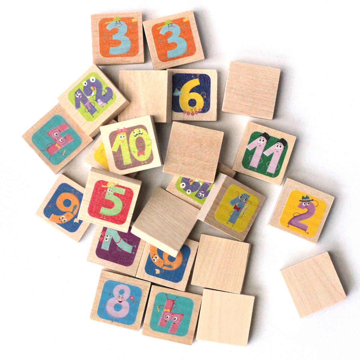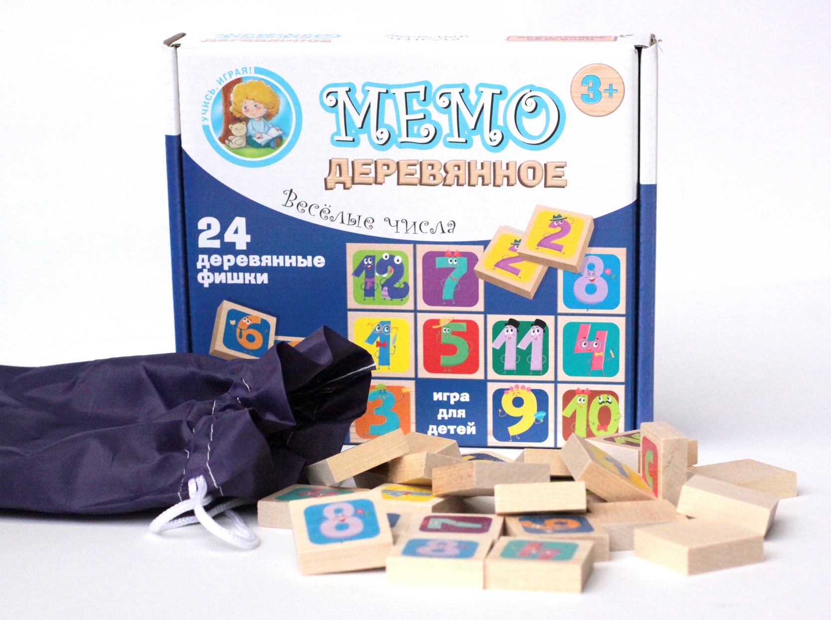 Классическая игра формата «мемо» для тренировки памяти. Состав игры: деревянные фишки – 24 шт. (3 х 3 х 1 см), текстильный мешок. Материалы: дерево, текстиль. Картинки нанесены на фишки с помощью прямой печати по дереву. Игра для 1-2 игроков, для детей от 3 лет. Правила игры на обороте коробки. Развивает логику, память, знакомит с числами от 1 до 12.