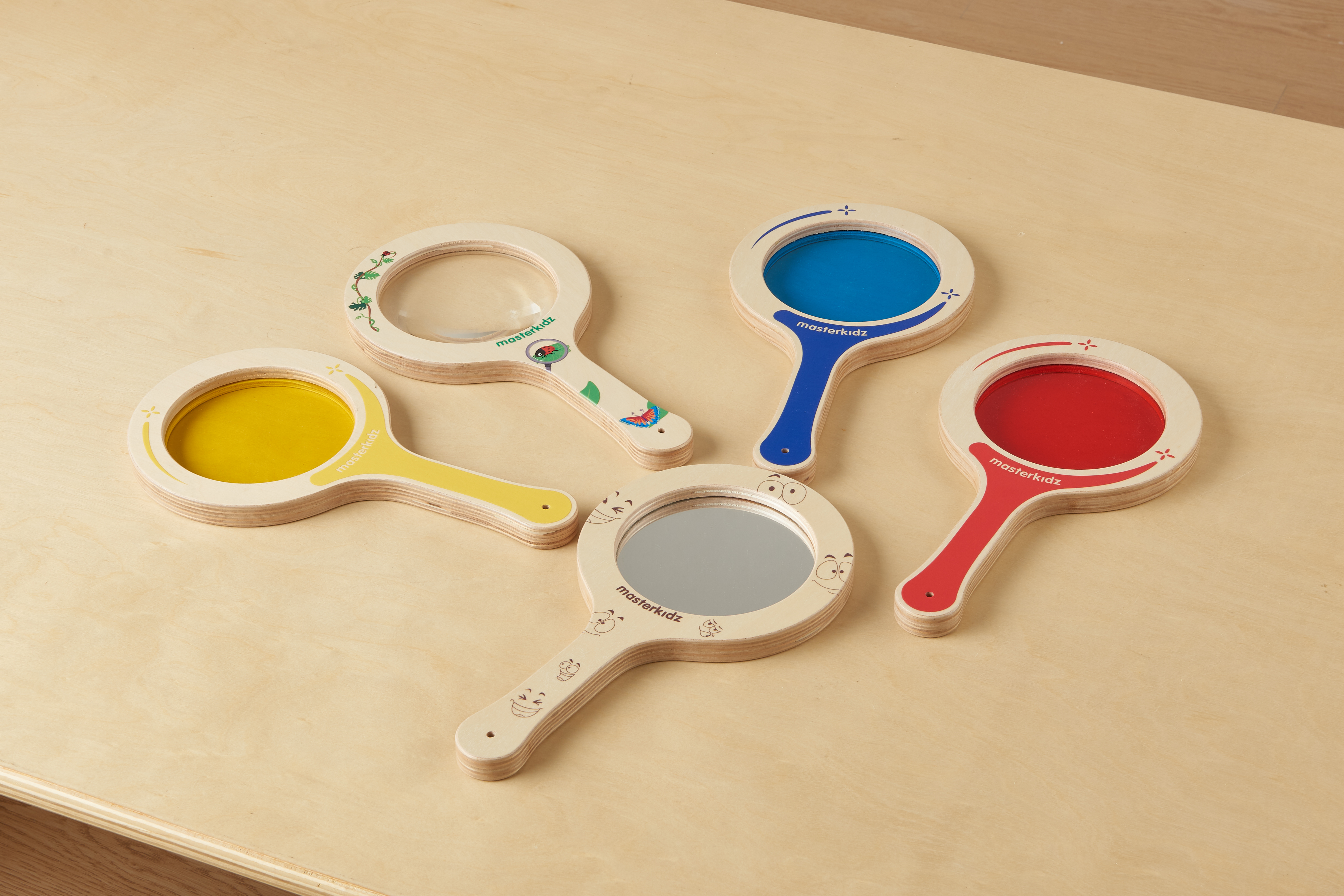 Набор из 4 луп с удобными деревянными ручками 4-х цветов (красный, синий, желтый, зеленый). В каждом имеется увеличительная линза с 3х - кратным увеличением. В комплект входит прочный деревянный органайзер для хранения.