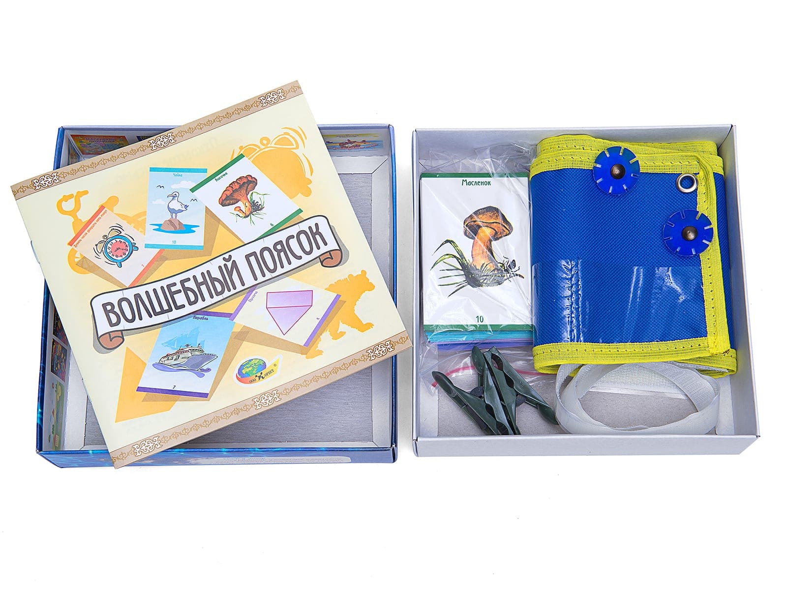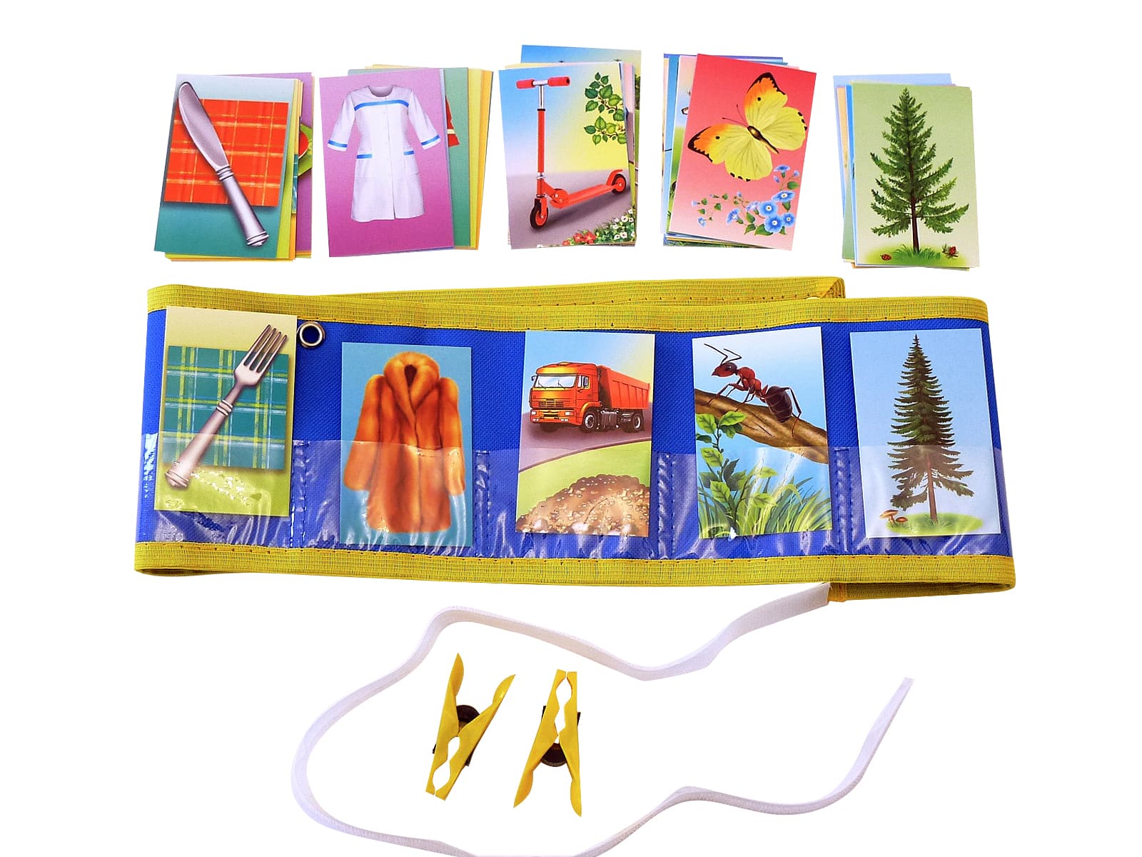 Состав: поясок с десятью кармашками, 50 тематических карточек, прищепки, липучка.