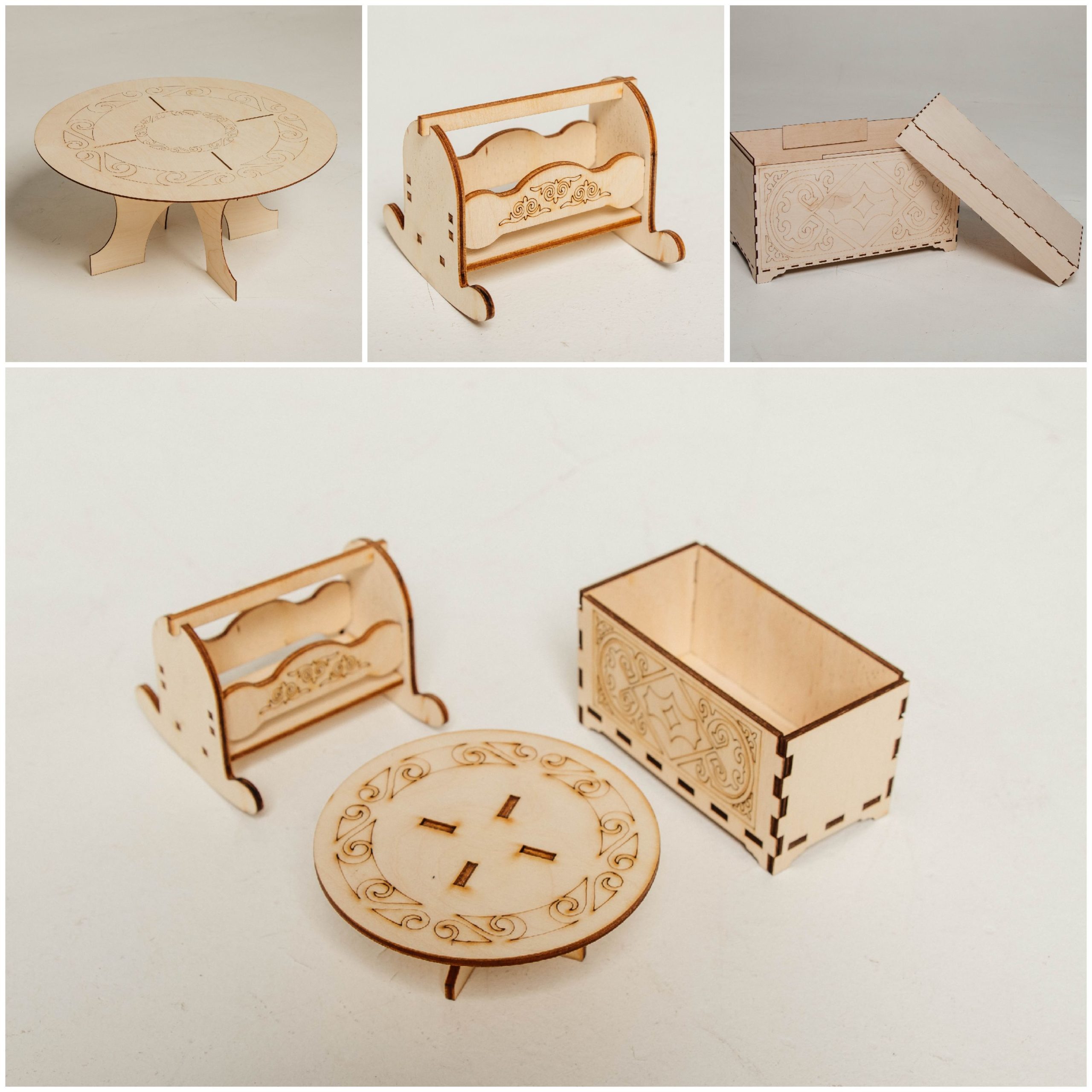 В набор входят такие предметы мебели: стол, люлька, сундук.