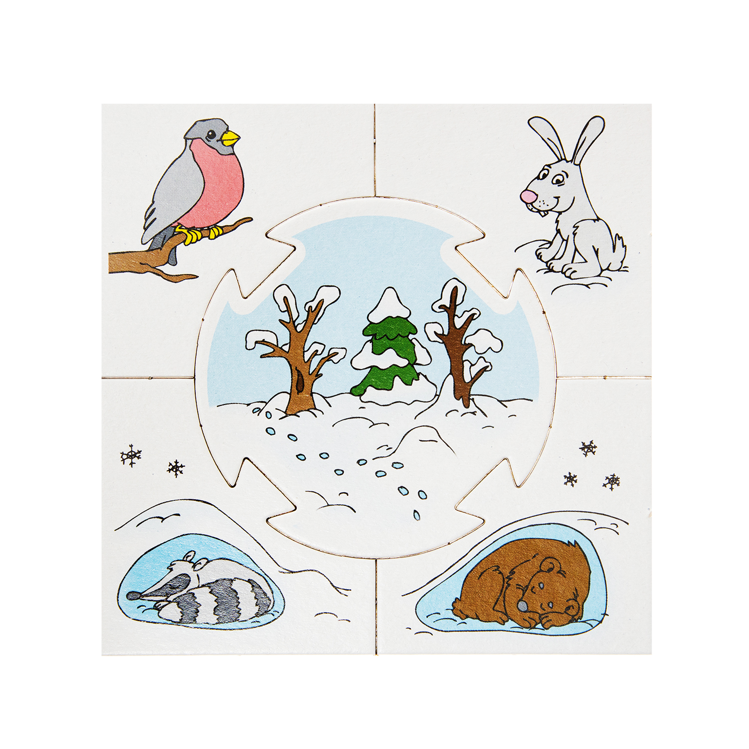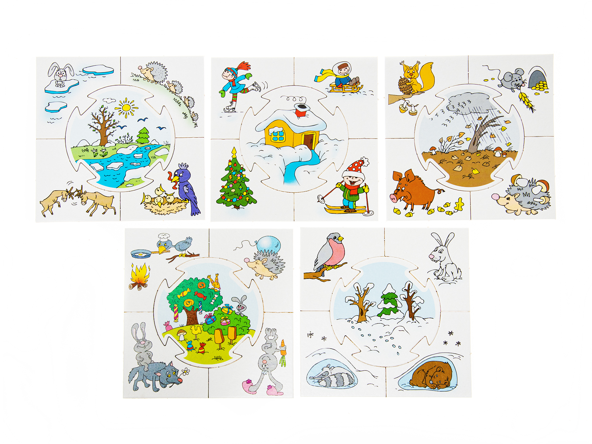Настольная игра «Времена года» (серия «Учись, играя!»). Состав: круглые карточки – 10 шт., карточки – 40 шт. Материал: бумага, картон. Для детей от 3 лет. Развивает память, логическое мышление и мелкую моторику пальцев рук.