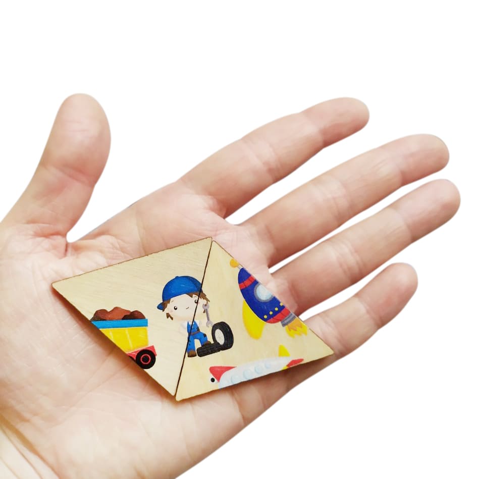 Деревянный пазл в форме шестигранника с треугольными фишками. Состав: игровое поле в форме шестигранника (размер по горизонтали – 22,5 см, размер по вертикали между параллельными сторонами – 19,5 см), треугольные фишки – 24 шт. (размер – 5 х 5 х 5 см). Основа пазла имеет углубление, в котором ребёнку необходимо расставить треугольные фишки так, чтобы все картинки совпали. На каждой фишке – не целая картинка, а только фрагменты 30 рисунков, которые удастся увидеть в том случае, если ребёнок сможет верно сложить все фишки. Картинки посвящены транспортной тематике. Игра расширяет кругозор, а также тренирует логику и мелкую моторику рук.