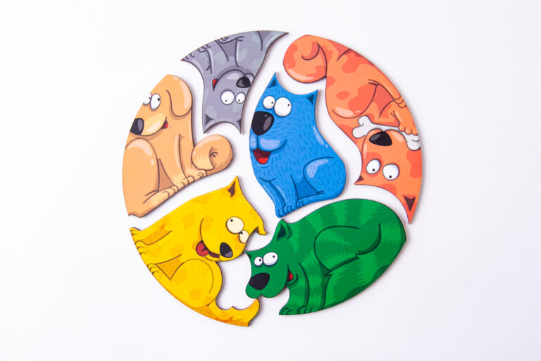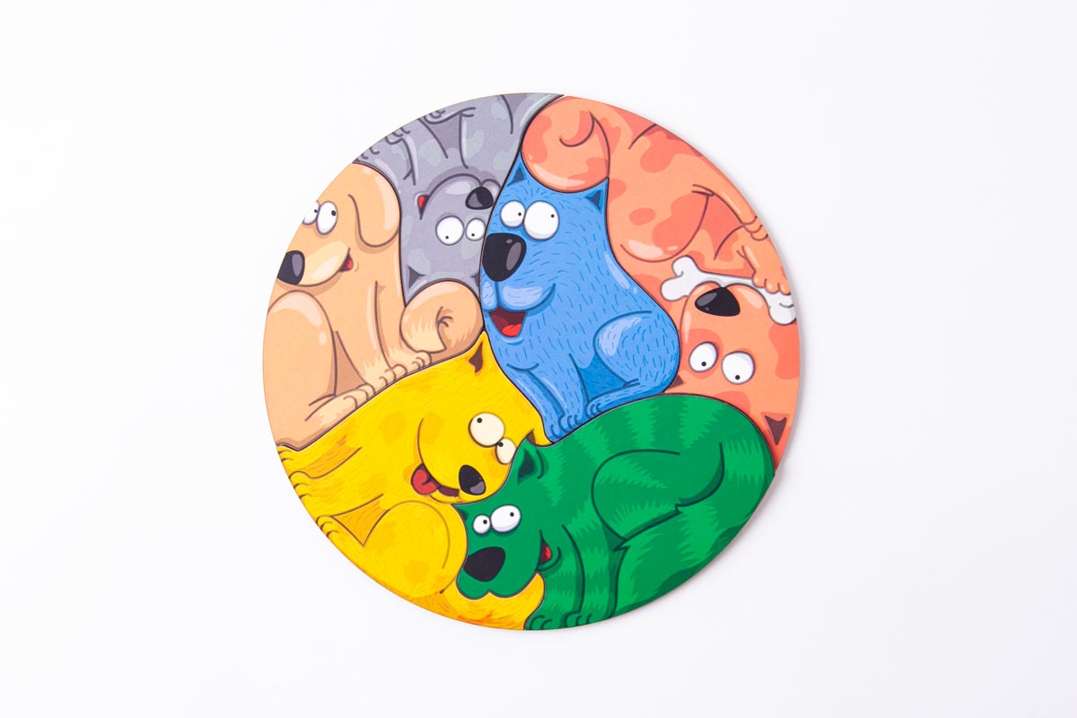 Пазл это игра-головоломка, в которой требуется составить мозаику из фрагментов рисунка различной формы. В данном случае – композицию из фигурок забавных собачек. Собирая пазлы, опирайтесь на рисунок в инструкции.