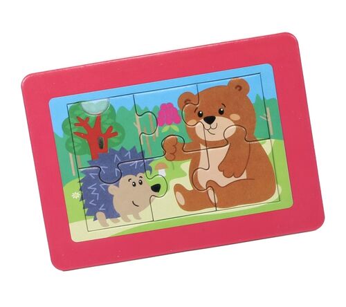 Пазл состоит из 6 крупных элементов (3х4 см) и основы в виде рамки (10,5х14,5 см). На основе напечатан рисунок лесных жителей. Изображения наносятся с помощью прямой печати, что обеспечивает износостойкость картинки.