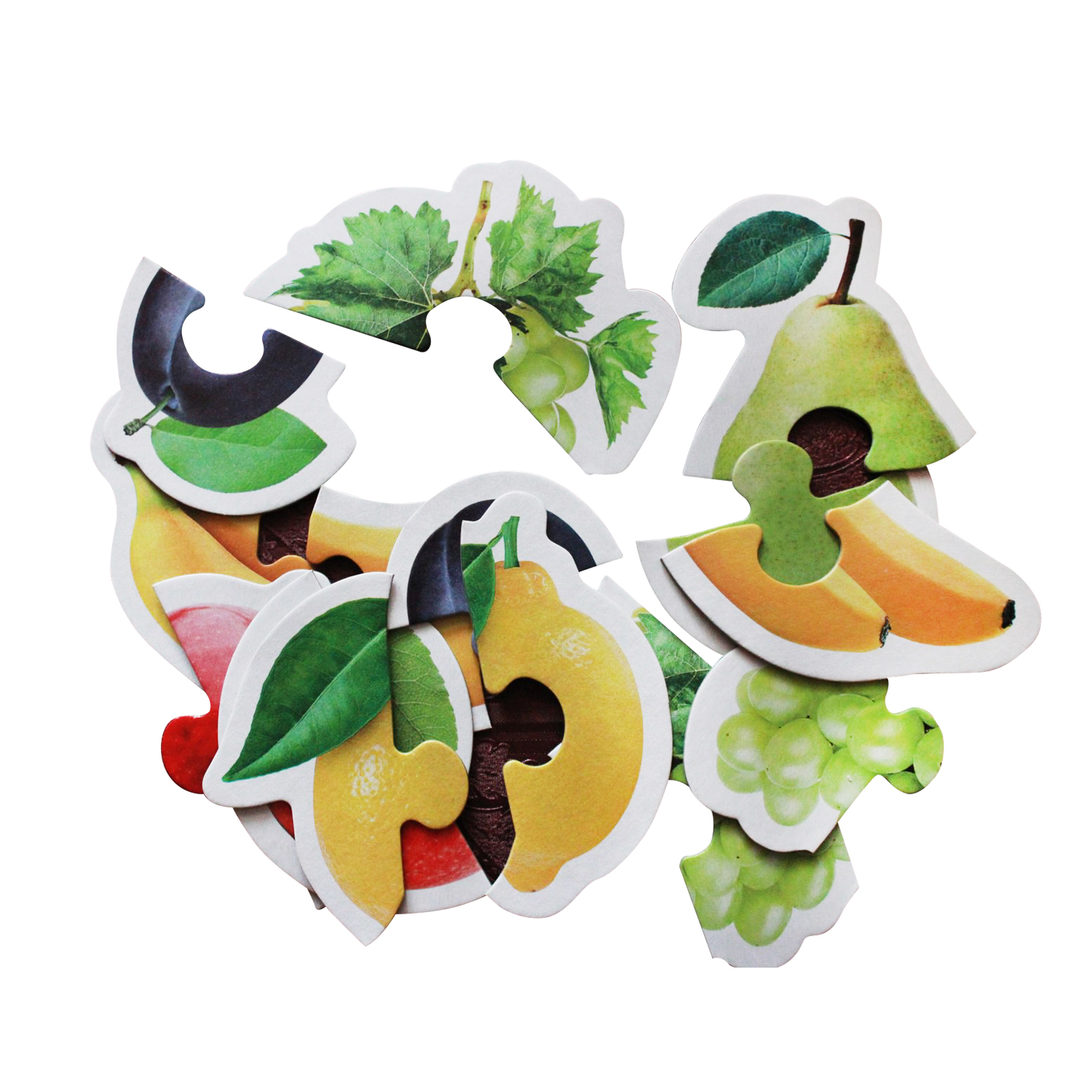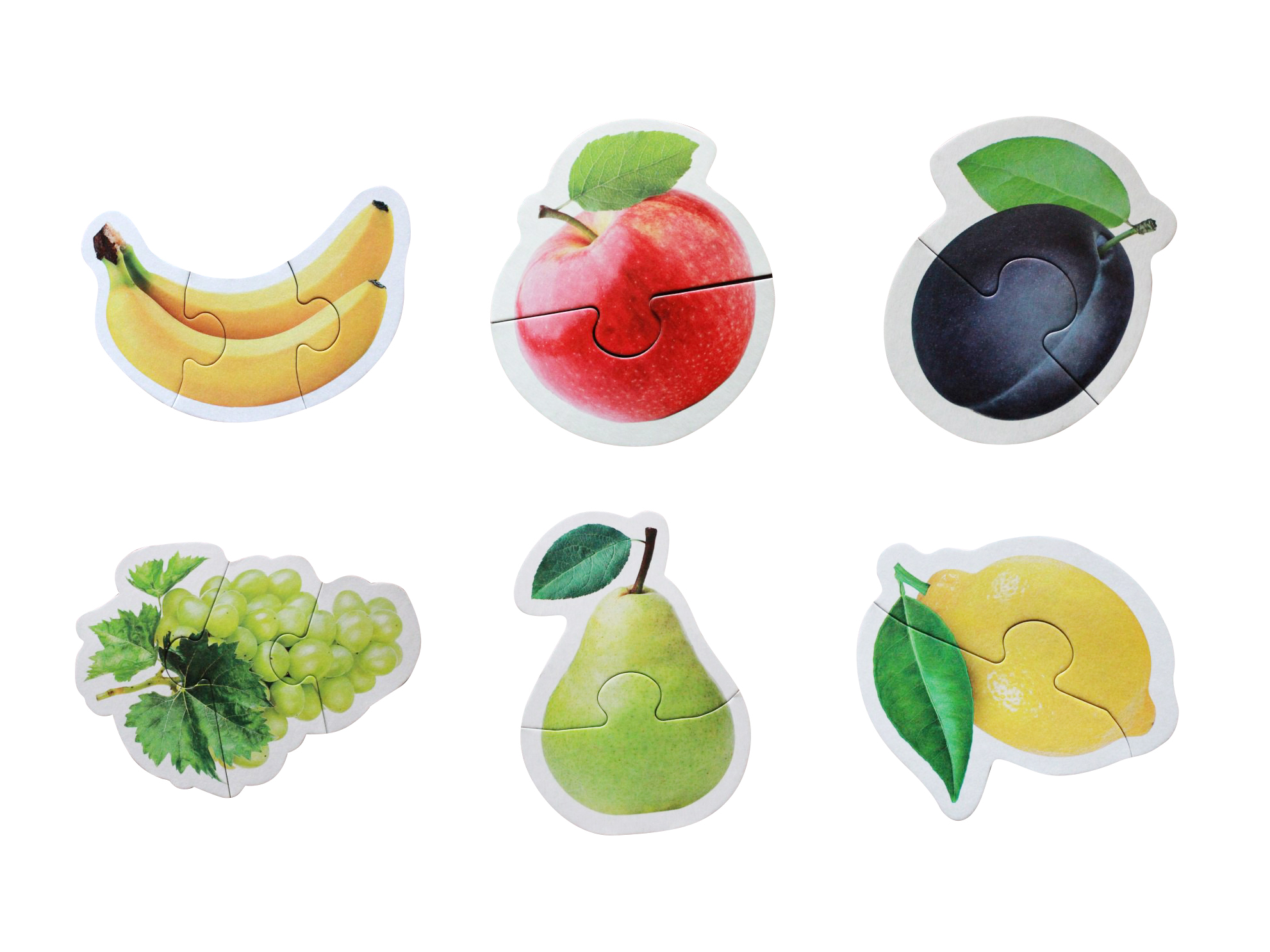 Игра предназначена для детей младшего возраста (3+). Крупные элементы удобны для ручки малыша. В коробке 6 контурных пазлов (виноград, лимон, яблоко, бананы, слива и груша). Четыре из них состоят из 2 частей, а два из 3 частей. Всего 14 элементов. Размер каждой картинки, состоящей из трех частей примерно от 15 см до 19 см, а состоящей из двух от 8 см до 11 см. Пазлы изготовлены из плотного картона, хорошо держат форму. Чтобы они долго радовали Вашего ребенка необходимо соблюдать простое условие - не хранить во влажном помещении.