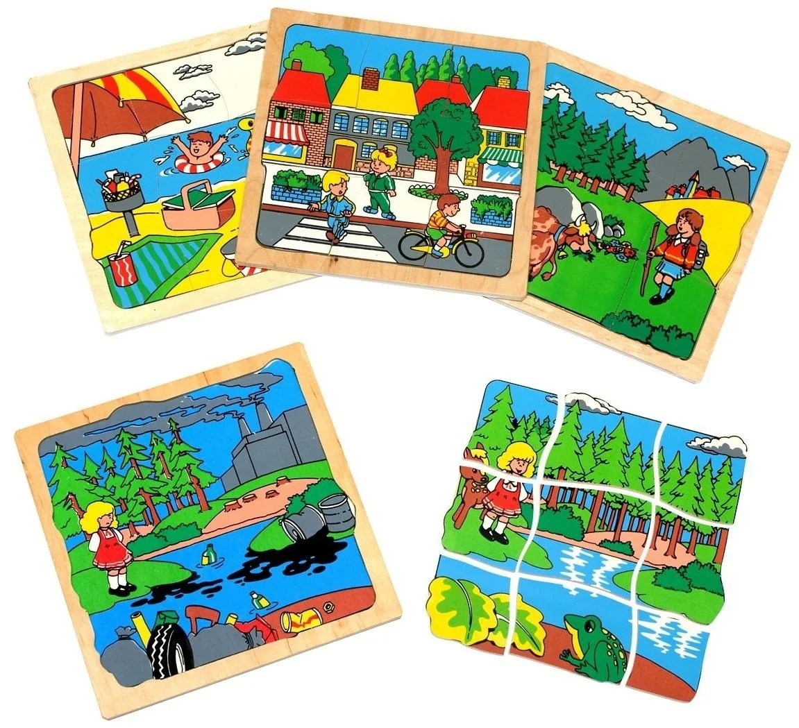 Пособие состоит из 4 планшетов, их размеры 22*22 см. Каждый планшет закрывается сборной картинкой-головоломкой, состоящей из 9 деталей-частей. Верхняя картинка изображает экологически чистый уголок земли (город, водоем, горы, пляж), а нижняя – ту же местность, но загрязненную и обезображенную цивилизацией. Серия демонстрирует две модели отношения к природе, заставляет детей задуматься о том, что «правильно», а что «неправильно».