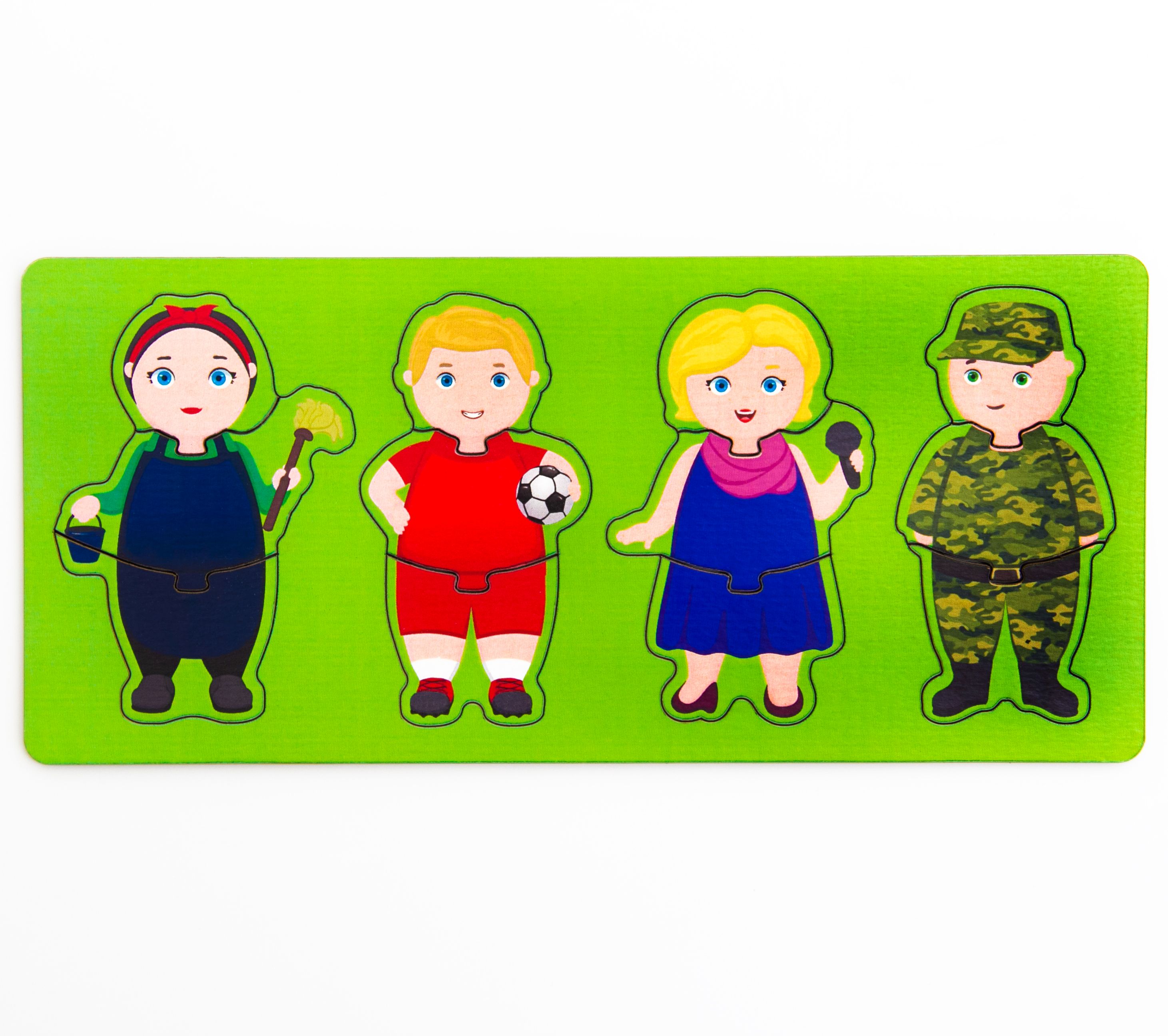 Деревянная плашка – 1 шт. Составные картинки 4 шт. с изображением людей разных профессий (уборщица, футболист, певица, солдат). Каждая картинка поделена на три части.