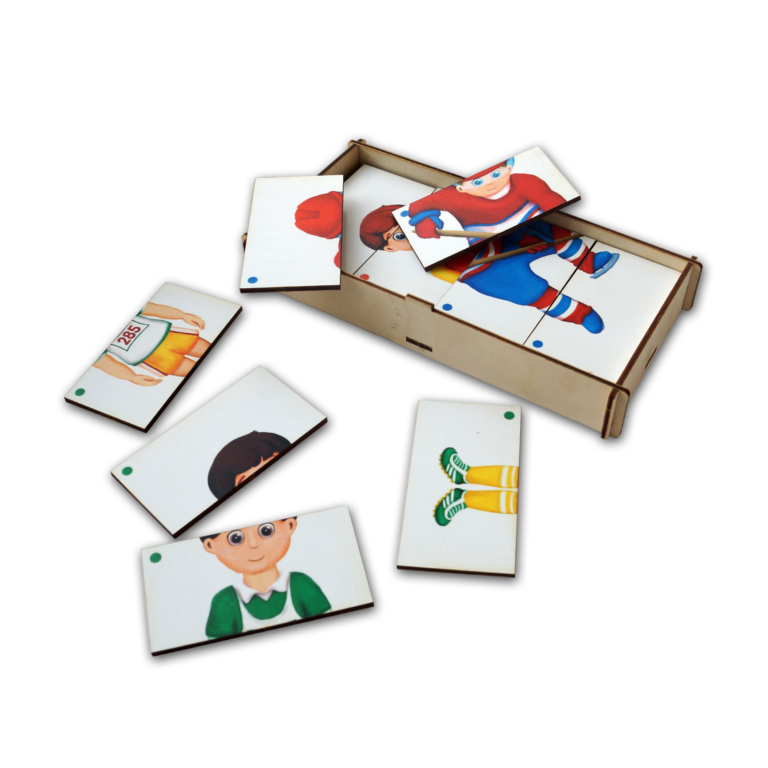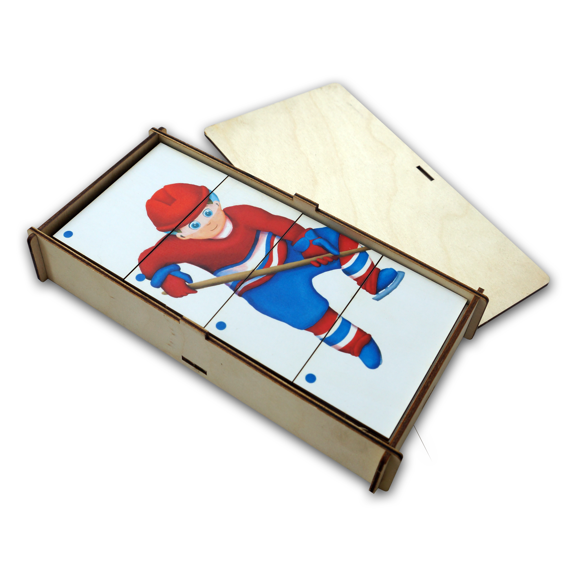 Деревянный ящик для хранения картинок с крышкой – 1 шт. Составные картинки 6 шт. с изображением людей разных спортивных направлений. Каждая картинка поделена на четыре части.