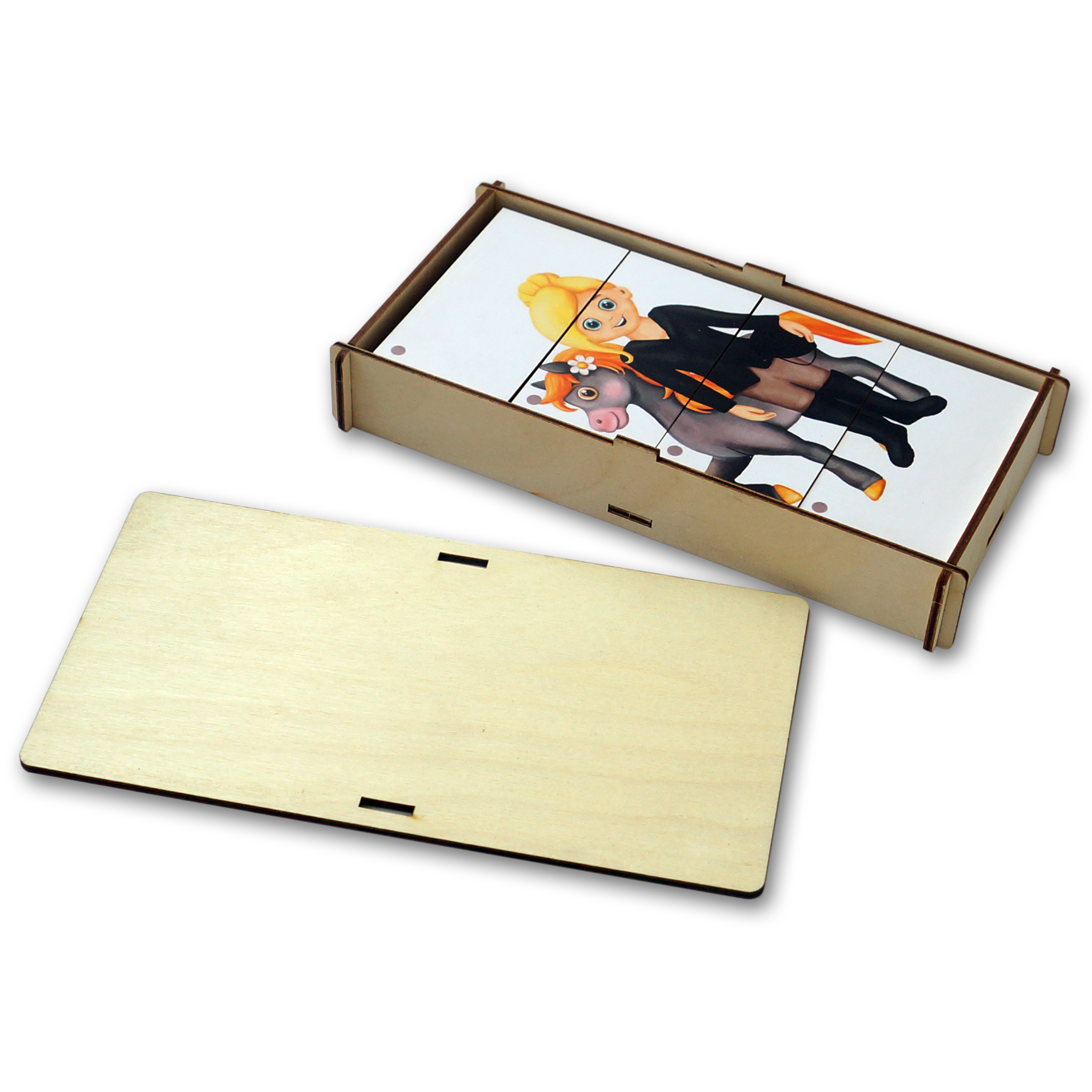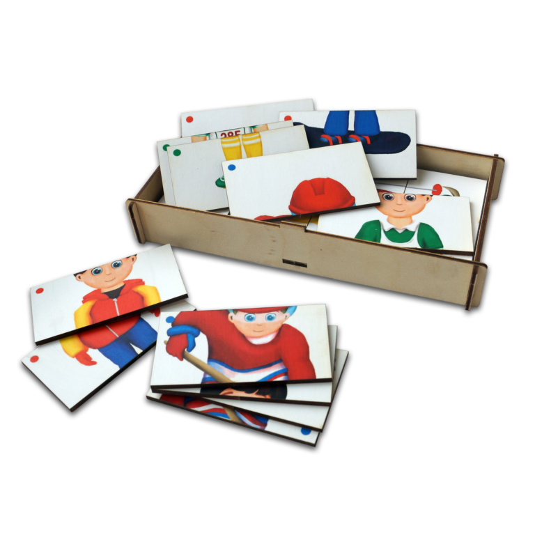 Деревянный ящик для хранения картинок с крышкой – 1 шт. Составные картинки 6 шт. с изображением людей разных спортивных направлений. Каждая картинка поделена на четыре части.