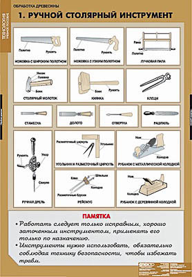Ручной столярный инструмент. Устройство столярного верстака. Типы графических изображений. Чтение чертежа. Технологическая карта. Разметка заготовок. Строгание, сверление, долбление. Пиление, выпиливание, зачистка. Сборка изделий. Токарный и сверлильный станки. Правила поведения в мастерских. CD диск.