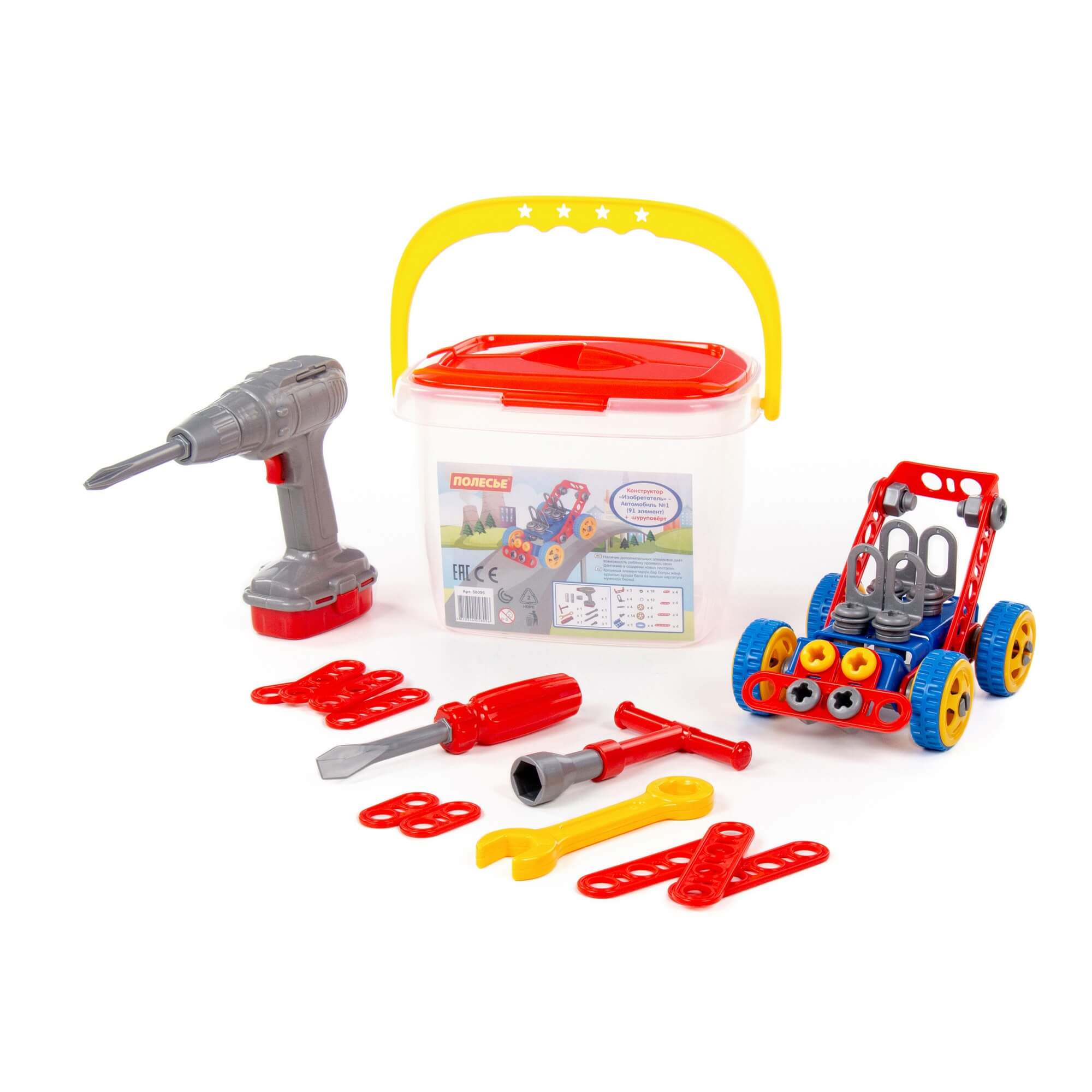 Конструктор Изобретатель - Автомобиль №1 91 элемент + шуруповёрт в ведёрке
