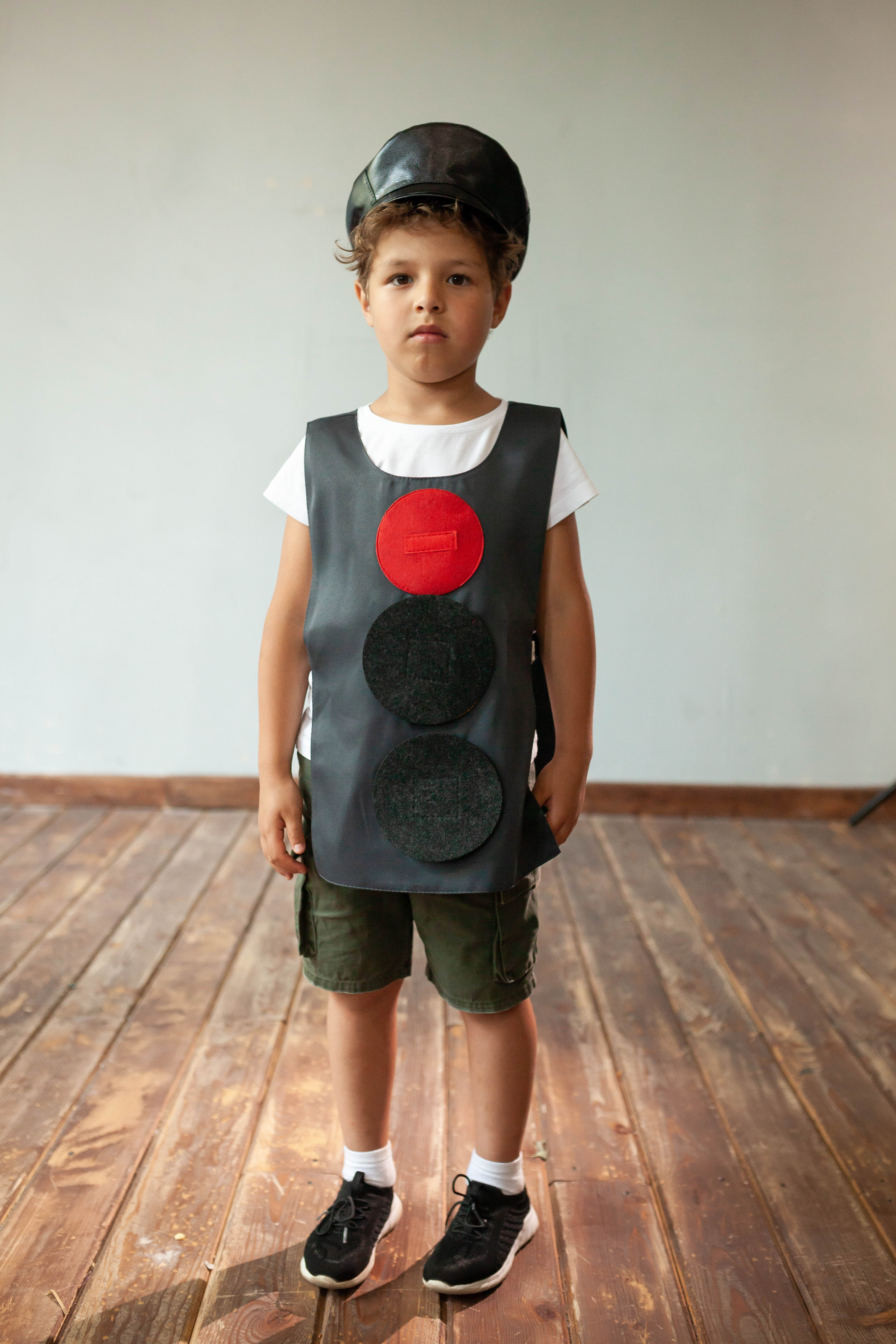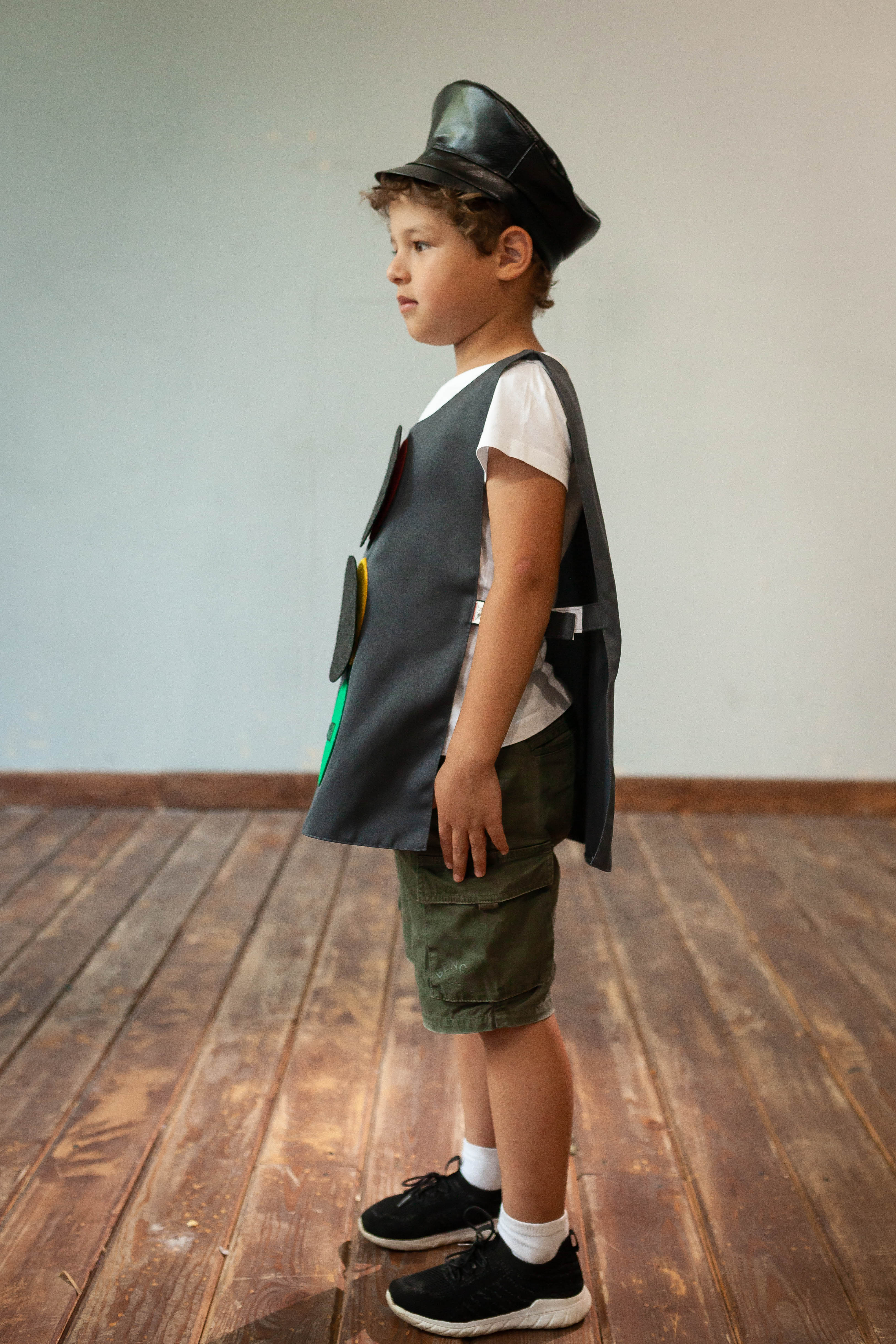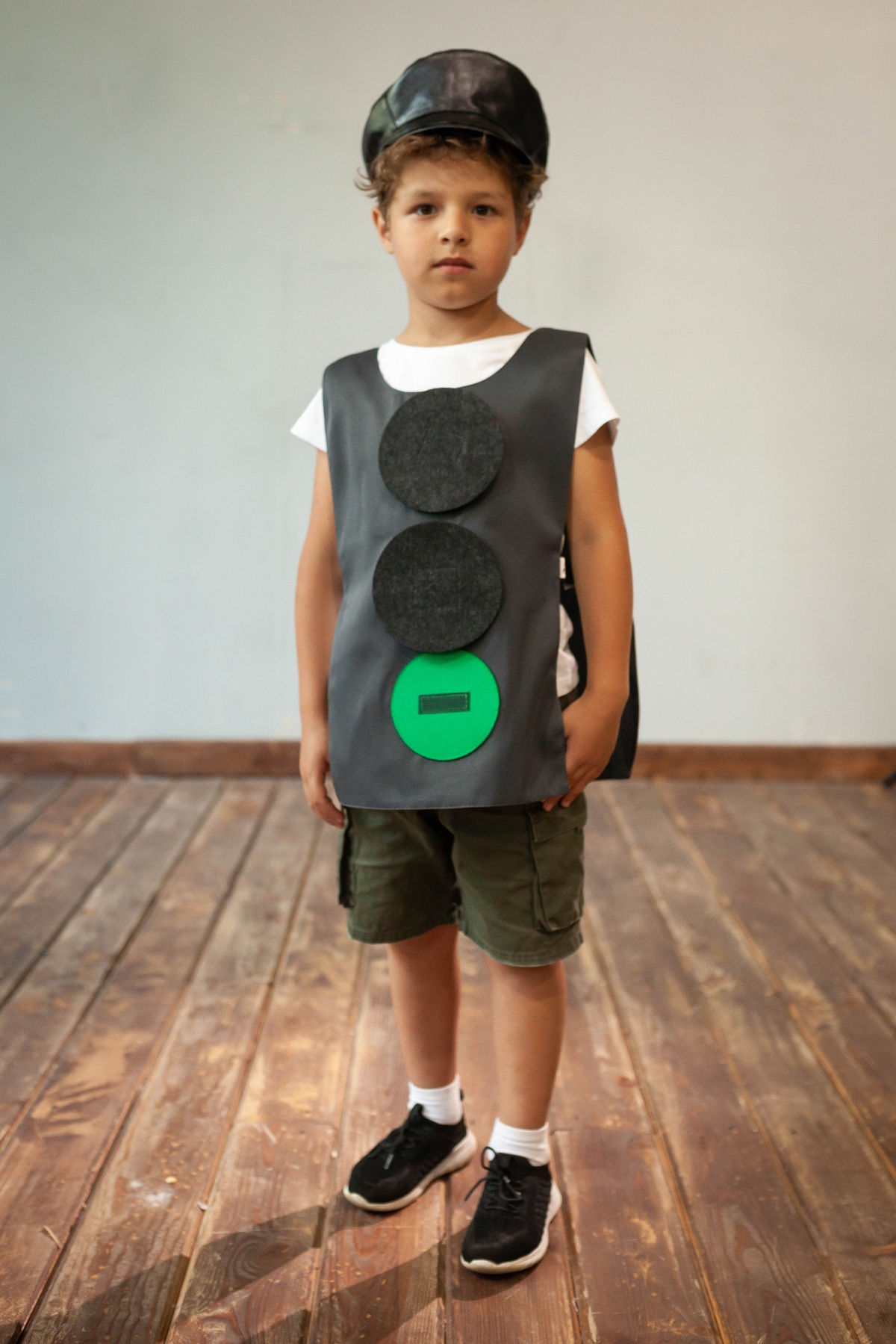 Материал — накидка — смесовая ткань 35% хлопка, 65 полиэстера, головной убор — искусственная кожа, козырек — пластик. Комплектация: накидка с застежкой на липучке по бокам с 3-мя кругами, нашитыми на ткань — красный, желтый, зеленый и 2-мя накладками из основной ткани (Накладки к кругам крепятся с помощью липучки), головной убор сзади на резинке.