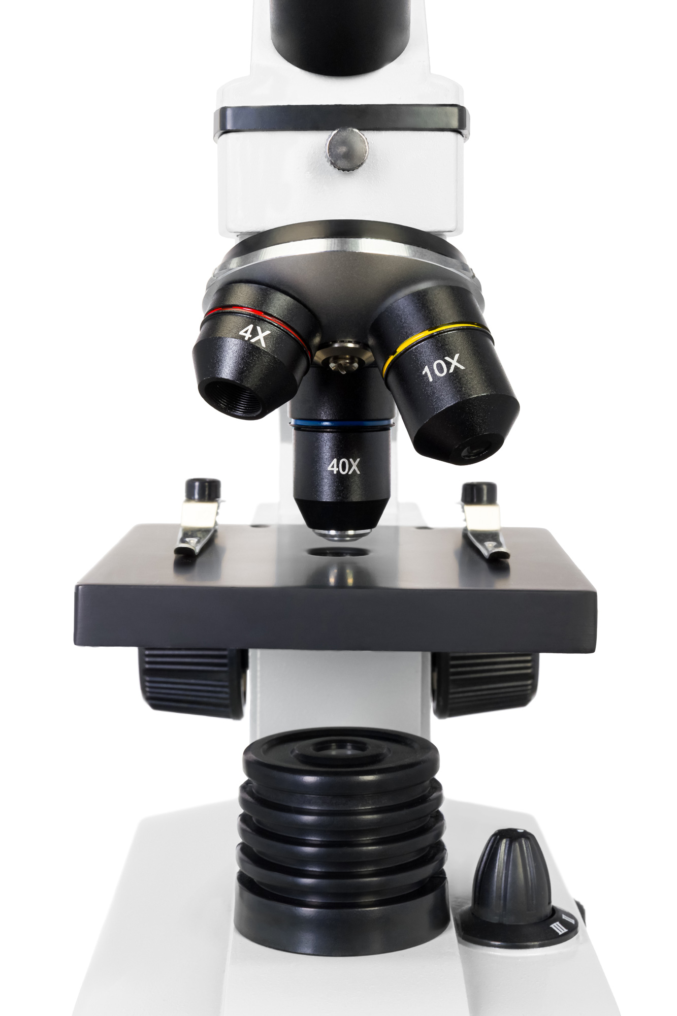 Три объектива позволяют получить широкий диапазон увеличений – от 64 до 640 крат. Для смены кратности нужно просто повернуть револьверное устройство. Объектив с наибольшим увеличением (40xs) снабжен пружинным механизмом, который надежно защищает оптику от повреждений. Если при фокусировке коснуться препарата объективом, он отодвинется и не сломается.