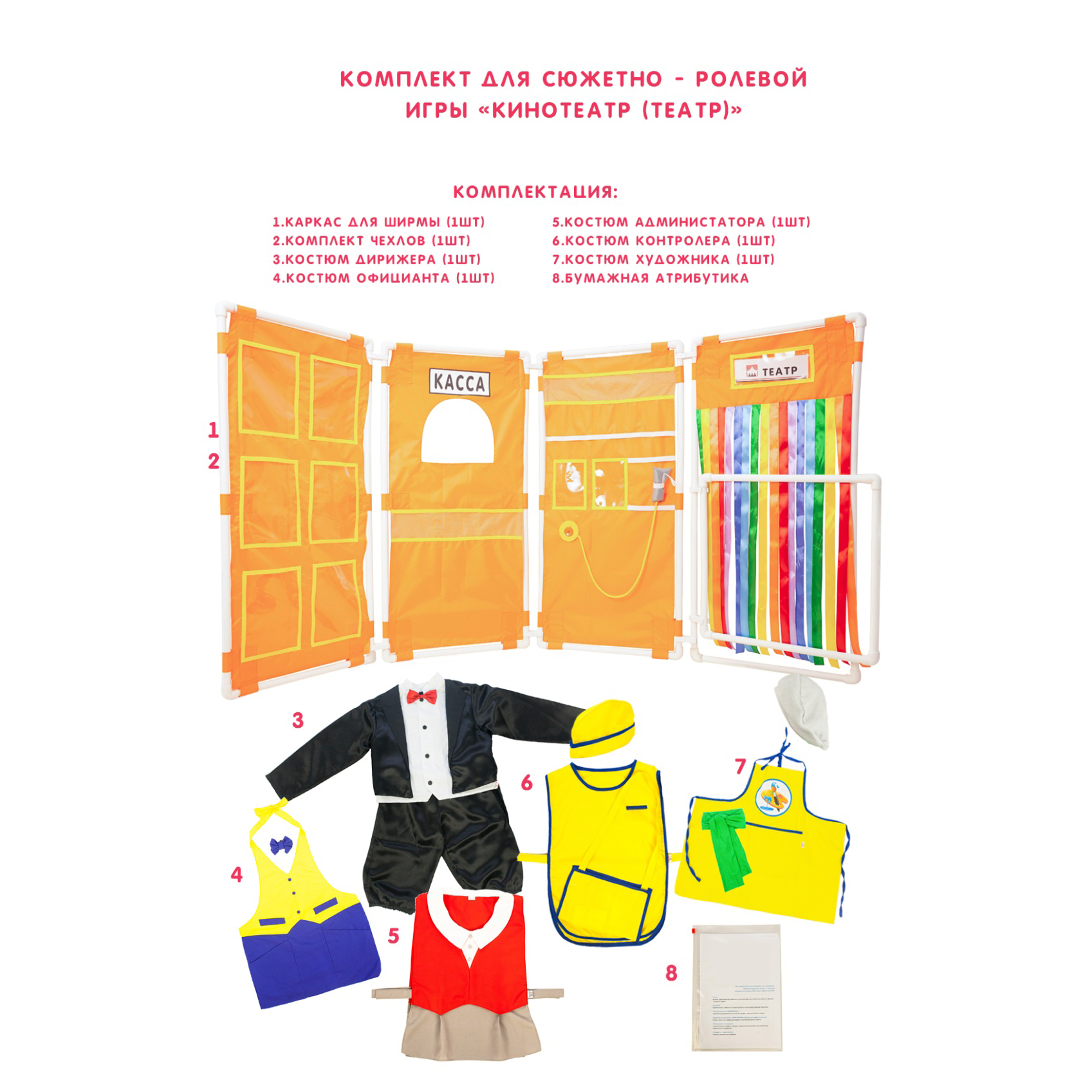 Материал: костюмы - смесовая ткань - 35% хлопка, 65% полиэстера, чехлы для ширмы - оксфорд - 100% полиэстер, ширма - 100% полипропилен. Комплектация: ширма из труб диаметром 25 мм из 4-х частей,комплект чехлов "Театр (Кинотеатр)", костюмы - администратор, официант, кондуктор (в роли контролера), дирижер, художник, бумажная атрибутика
