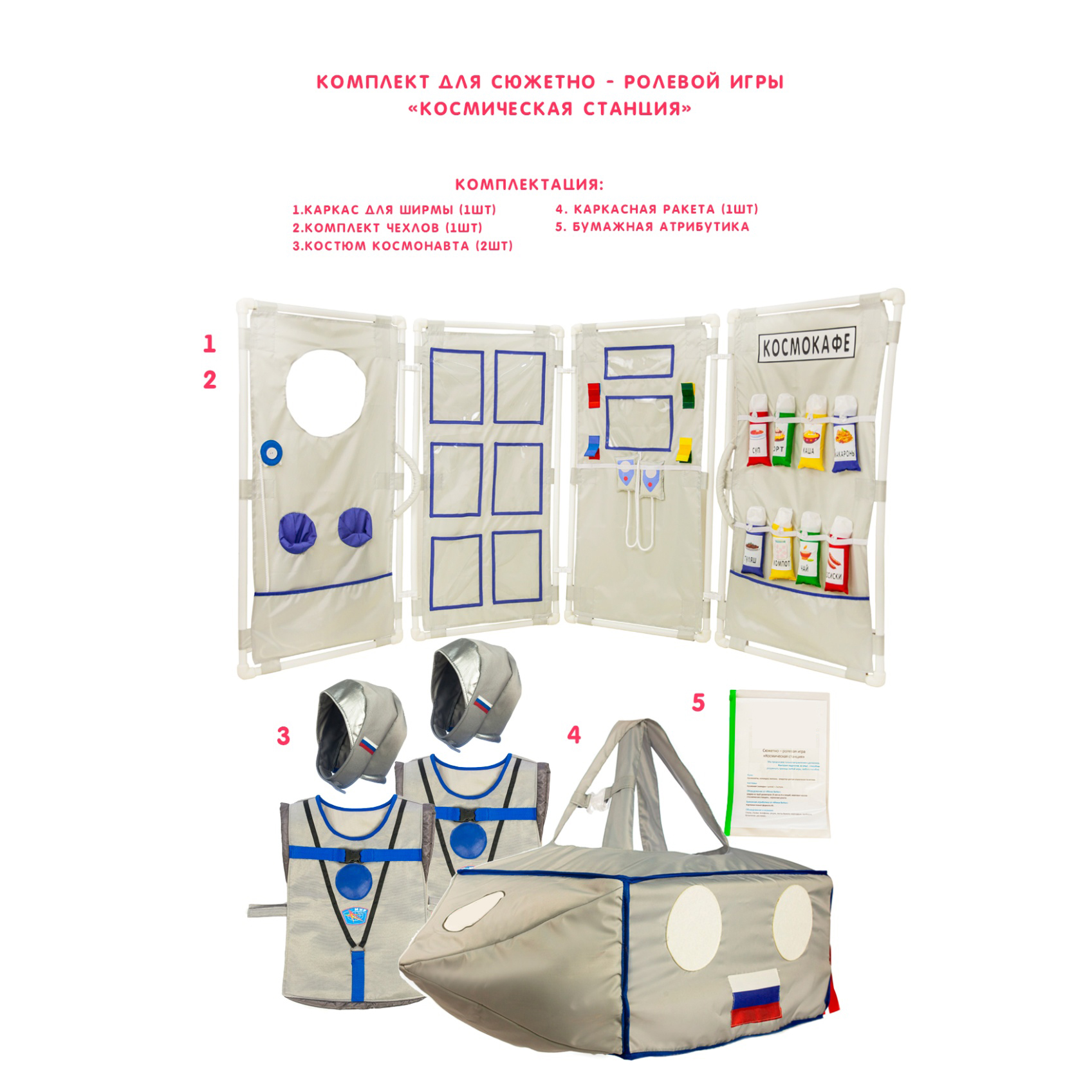 Костюмы: космонавт (накидка + шлем) – 2 штуки.