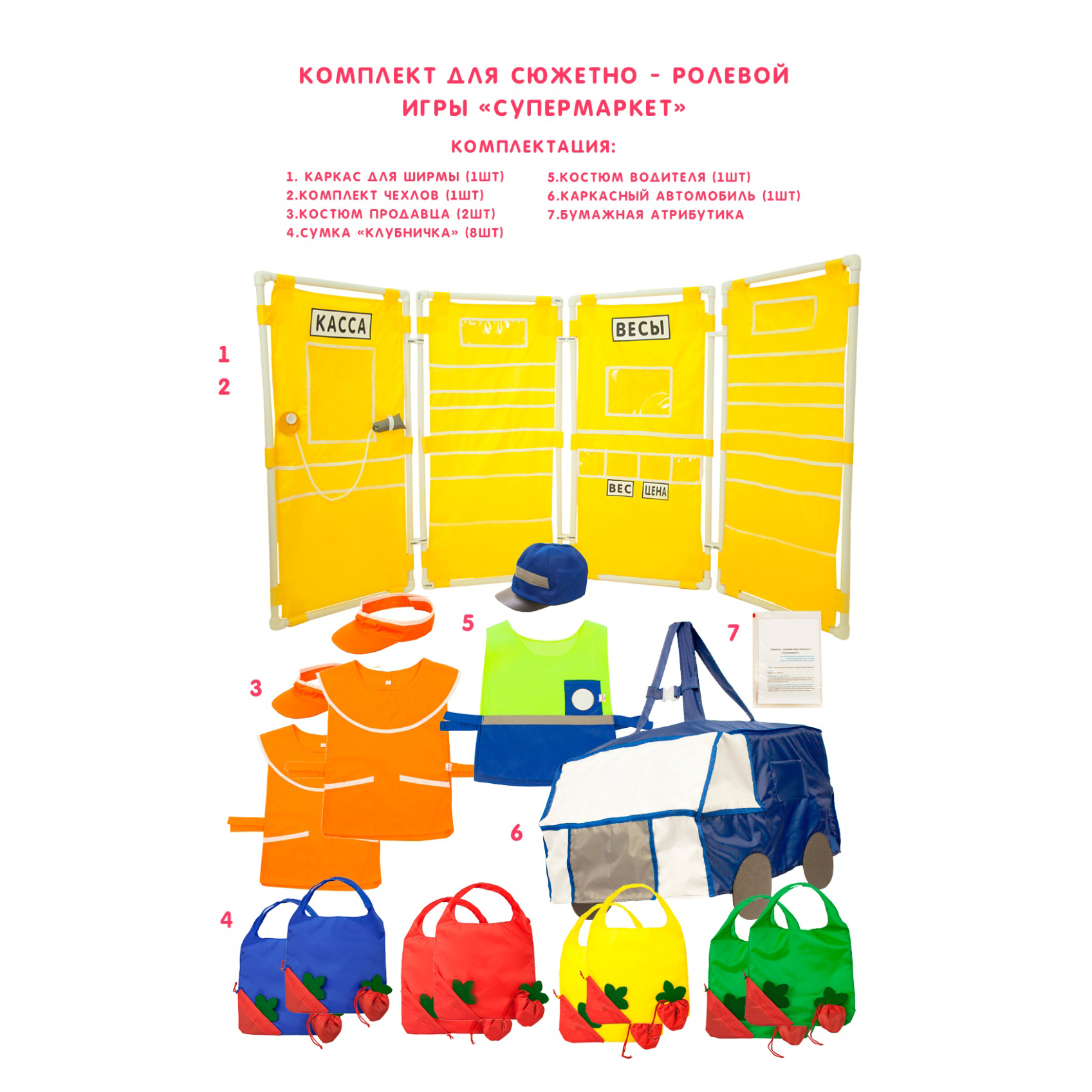 Бумажная атрибутика: кассовые чеки, ценники, счастливчики (прототип денег), картинка кассы, карточки с цифрами (от 1 до 10) два комплекта для весов, картинки овощей и фруктов, карточки – имитация сенсорных весов, права для водителя.