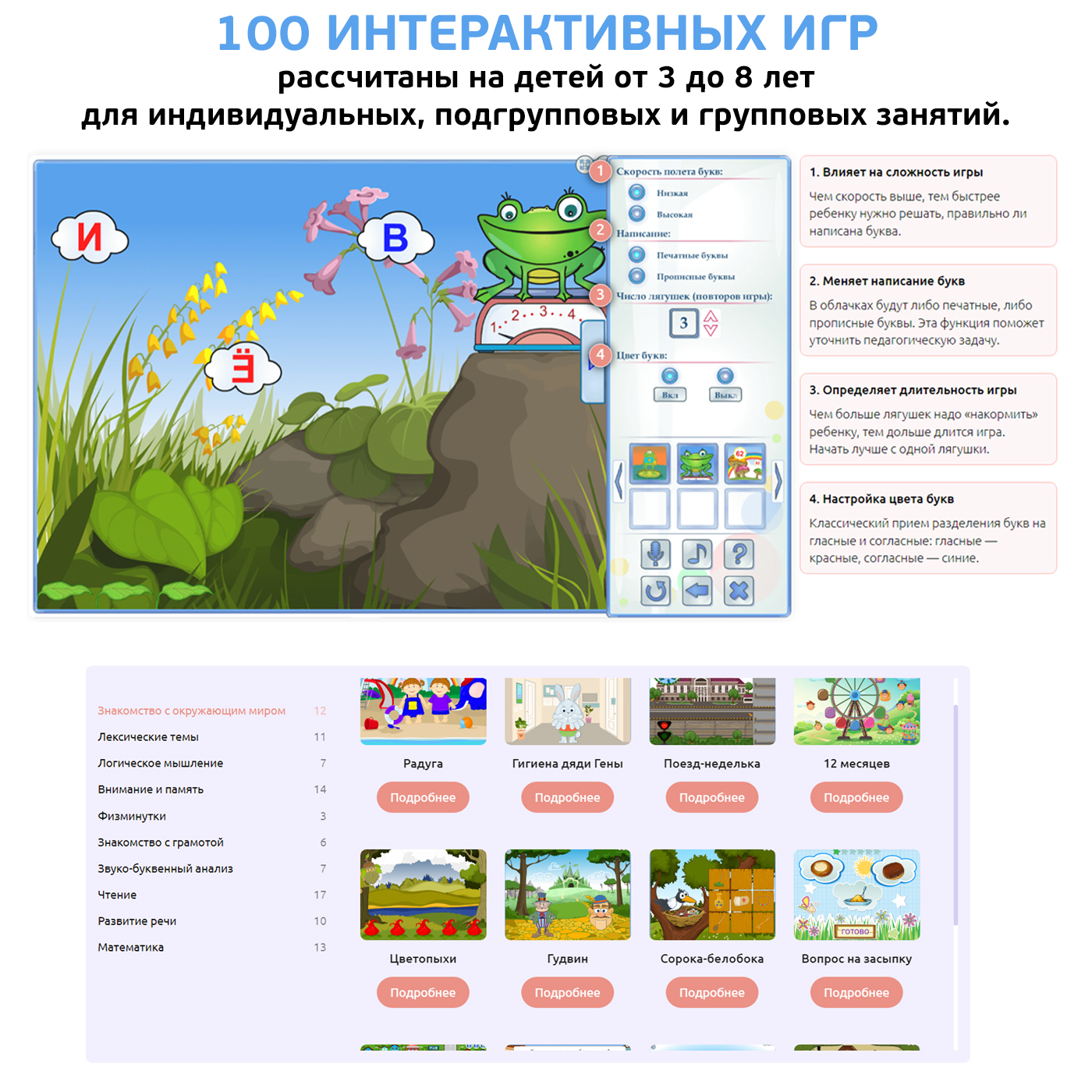 В комплексе 100 интерактивных игр и 142 пособия, программы для создания дидактических материалов и контроля динамики развития ребенка.