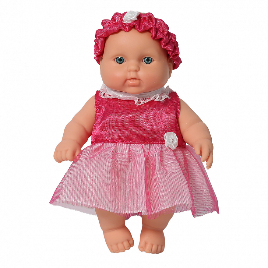 Это малыш с пухленькими щечками завоюет сердце любого ребенка, ведь он так нуждается в заботе и любви. В комплект одежды входит: нарядное платье, повязка на голову с цветком из атласной ленточки.