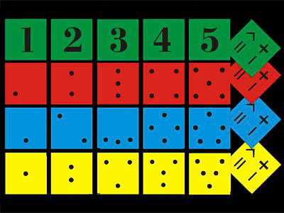 В набор включены квадраты четырех разных цветов с нанесенными на них кружочками и цифрами, причем одинаковое количество кружочков на квадратах разного цвета расположены по-разному. Подробнее