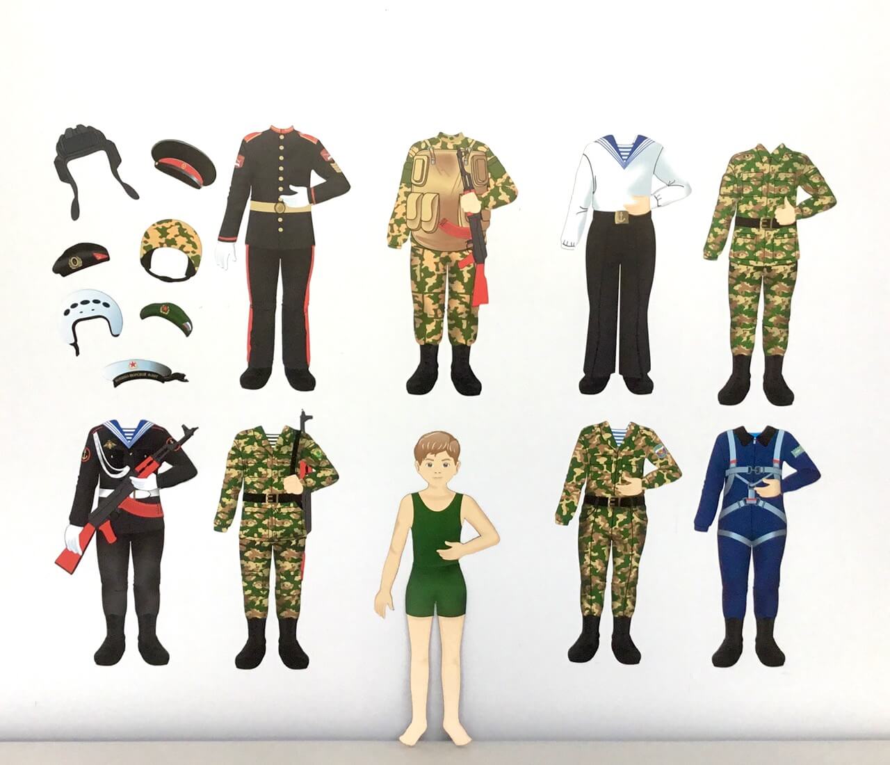 В комплекте 8 мальчиков и 16 магнитных карточек (одежда).