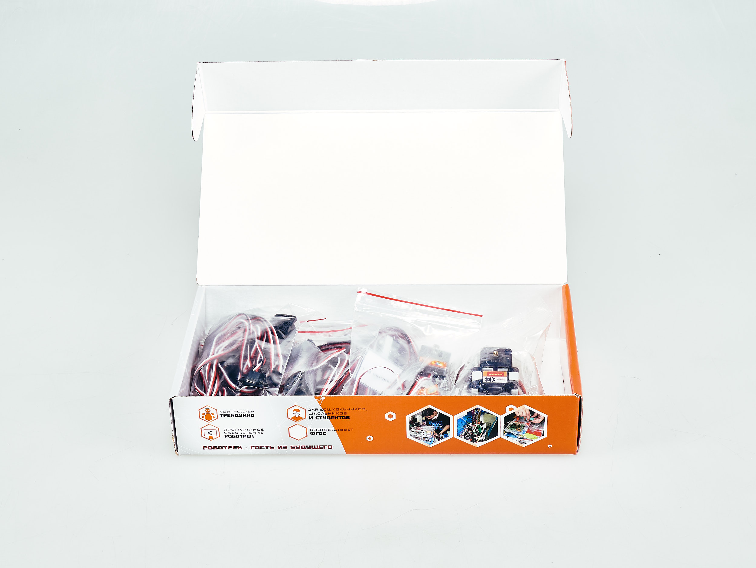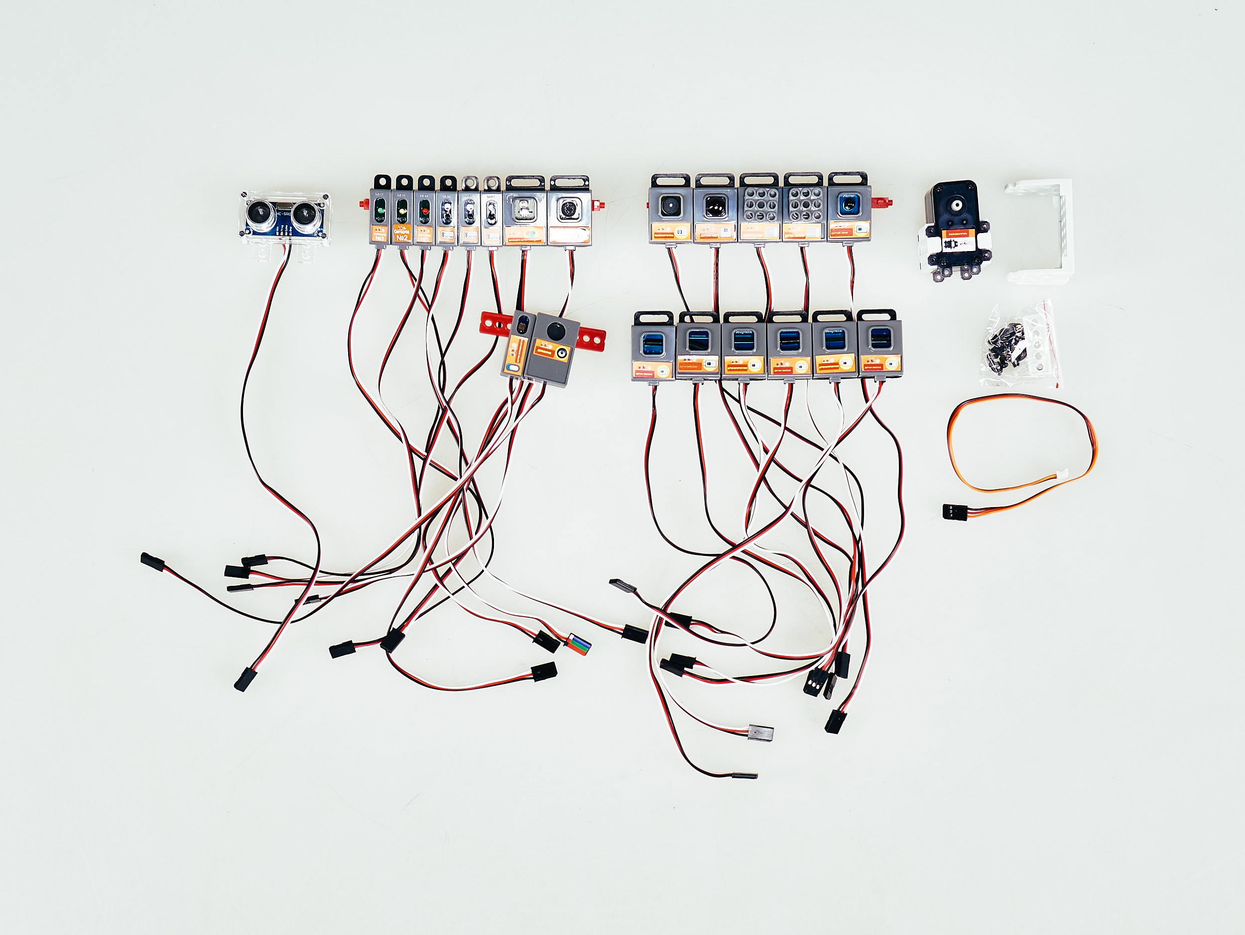 набор различных датчиков: 3 инфракрасных, 1 датчик освещенности, 1 датчик ПДУ, 2 датчика касания, 1 динамик, 1 пьезоизлучатель, 1 датчик звука, 3 датчика наклона, 1 датчик вибрации, 1 датчик огня,2 датчика магнитного поля, 1 датчик цвета+освещенности, 1 ультразвуковой датчик расстояния