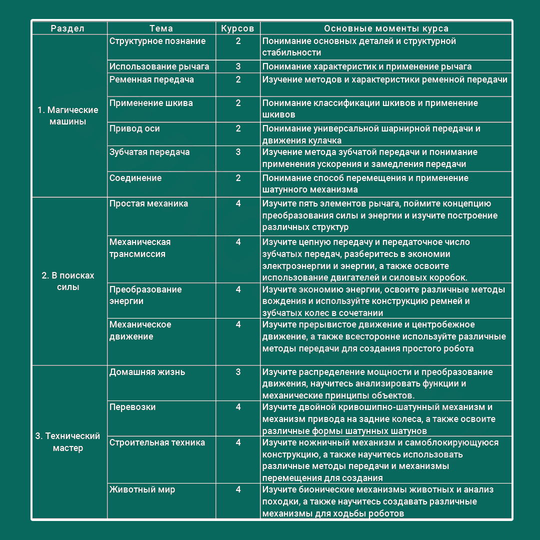 Этот набор содержит в общей сложности 48 уроков в три этапа, которые постепенно описывают состав, принципы работы, сценарии применения и т.д. различных динамических структур. Пункты знаний охватывают несколько предметных областей и подходят для детей в возрасте 6-10 лет, чтобы учиться и одновременно тренировать практические способности, наблюдательность и способность к аналитическому мышлению.
