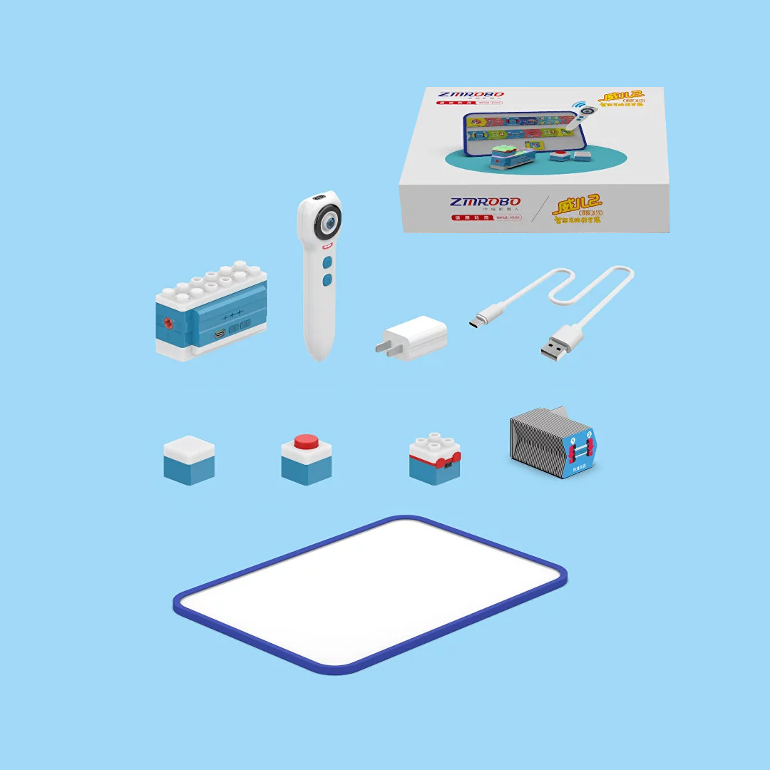 Умный мотор, умная ручка, адаптер питания, кабель usb-c, цветная лампа, датчик касания, ИК-датчик, магнитные карточки для программирования, доска для магнитных карточек.