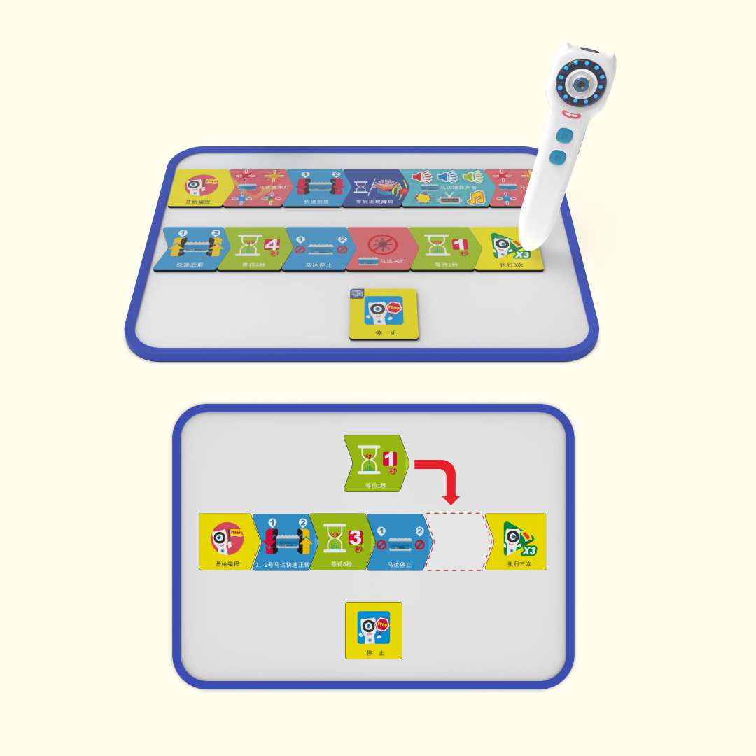 В общей сложности 7 категорий команд для составления программ. Дети выкладывают карты на белую доску, добавляя, удаляя или перекладывая их, чтобы скорректировать последовательное расположение. После того, как программа составлена, собранную модель робота можно запрограммировать с помощью умной ручки, чтобы последовательно выполннить все команды на умном моторе. Подробнее