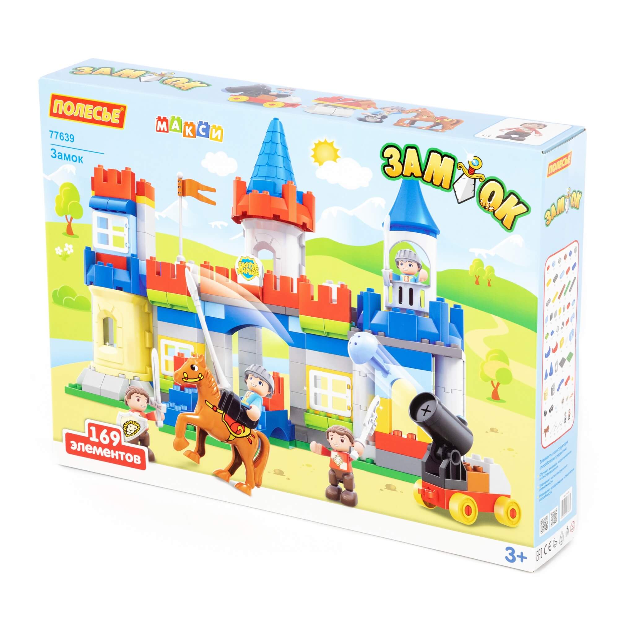 В комплекте: 169 элементов из яркого прочного пластика детали для строительства большого замка, башни, рыцарское обмундирование, человечки с подвижными ручками и ножками, лошадка, пушка на колесиках, флаг упакованных в удобную картонную коробочку.